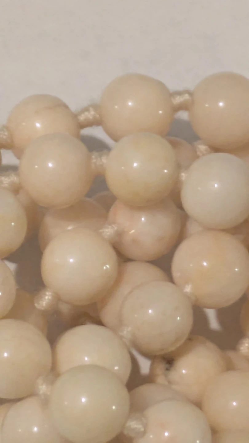 A beautiful and collectible vintage eternity strand of genuine, natural and rare Angel Skin coral. The beads feature a classic creamy-white base with soft "blush" pink zoning throughout.