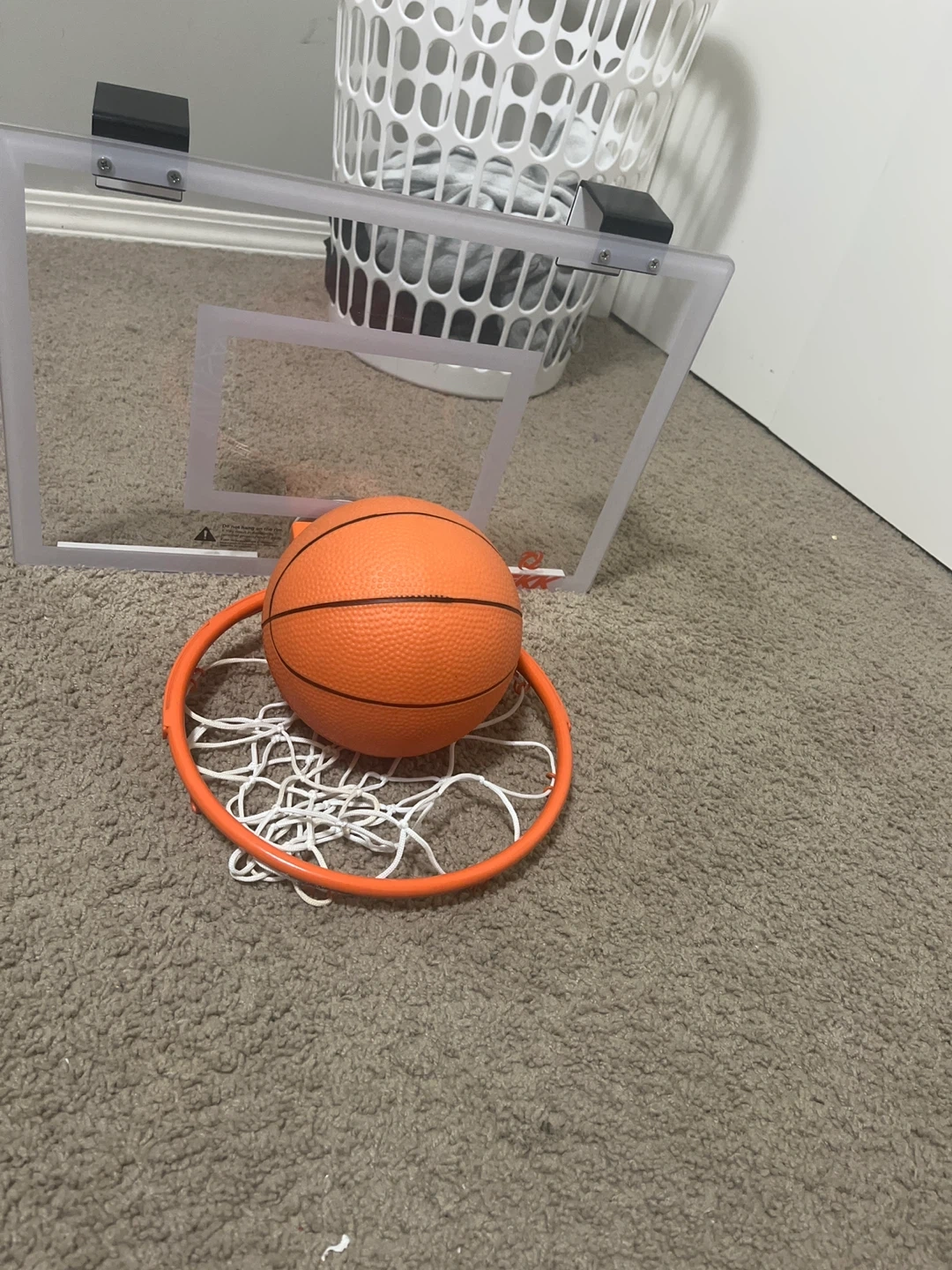 This indoor basketball hoop and ball set is great for some fun at home. It includes a clear backboard with an orange rim and a mini basketball. Easy to set up over a doorway or on a wall.