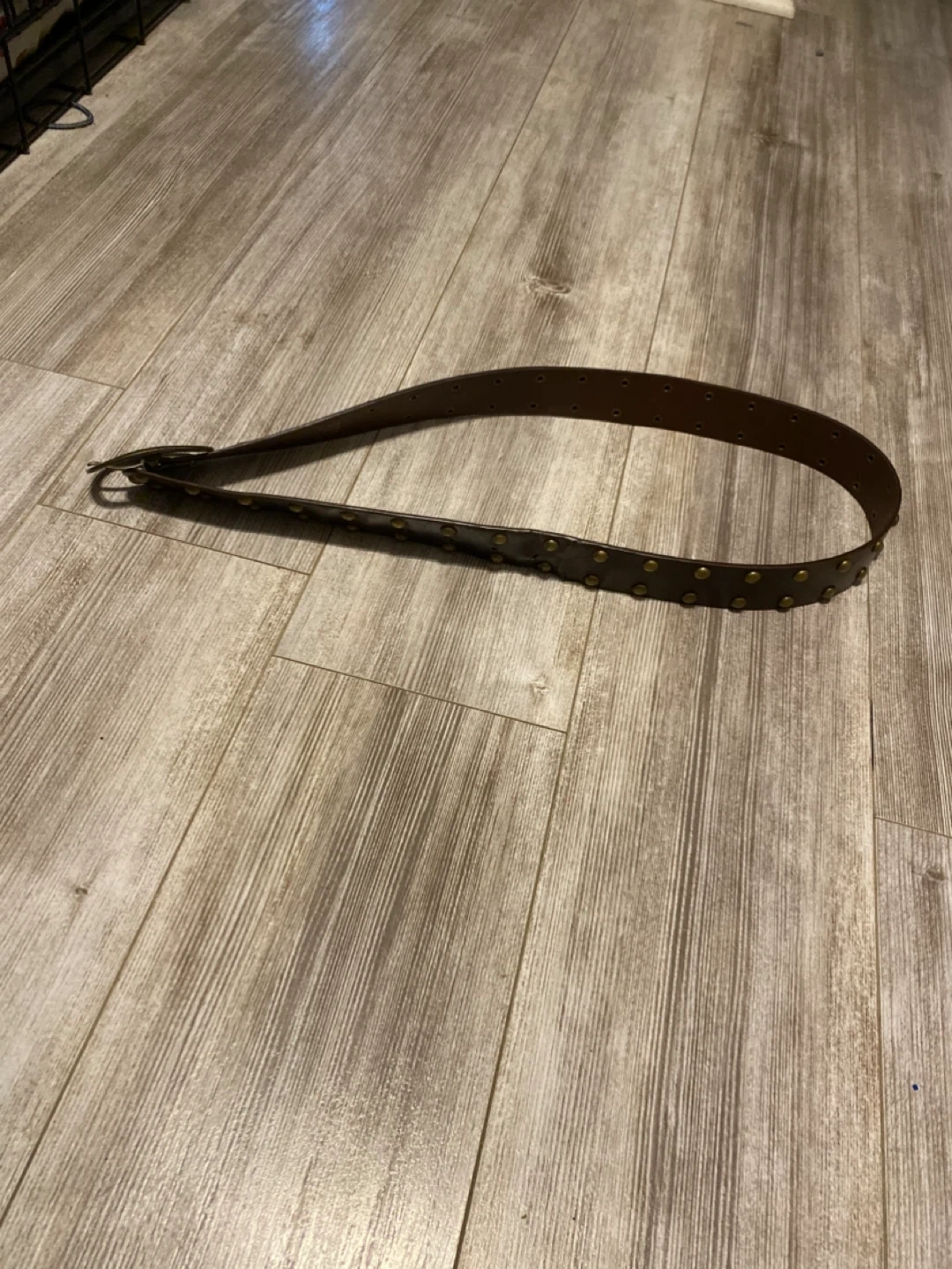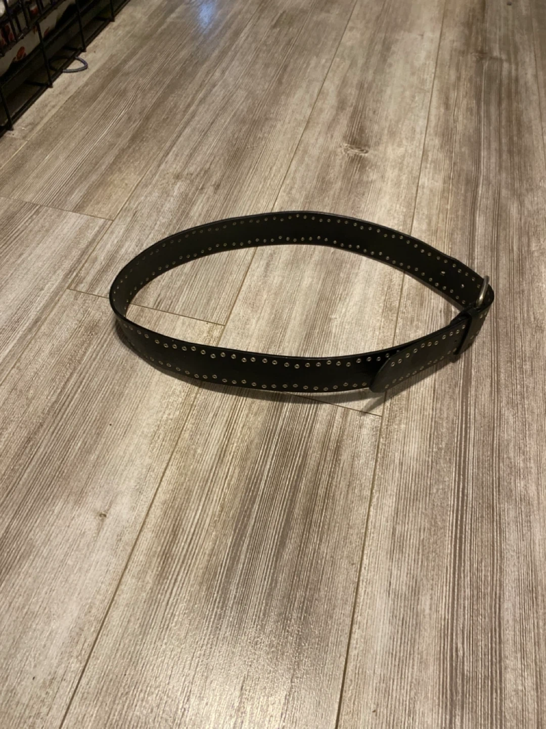 Includes one black studded belt with a silver buckle. Also includes two fabric belts, one with a star pattern and one with a plaid design. All belts are in good condition.