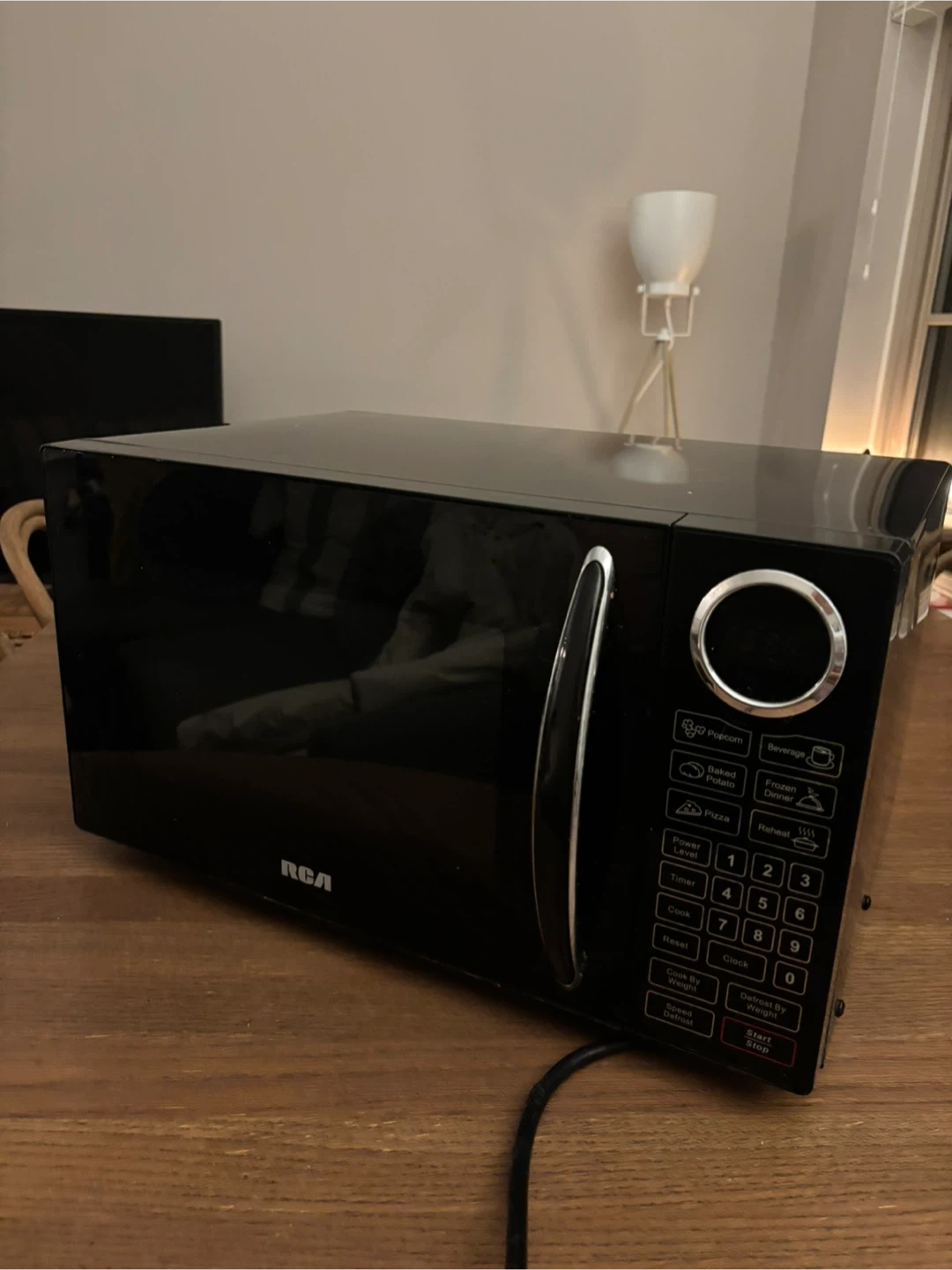 This is a black RCA microwave. It has various presets including Popcorn, Baked Potato, Pizza, Beverage, Frozen Dinner, and Reheat. It also includes options for Power Level, Timer, Cook, Reset, and Defrost by Weight. The digital display shows Clock and cooking time.