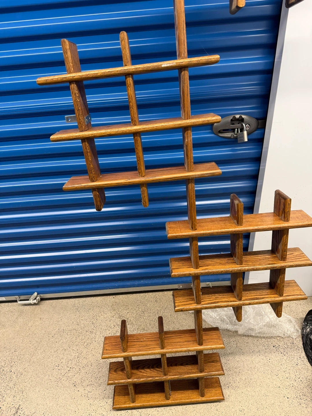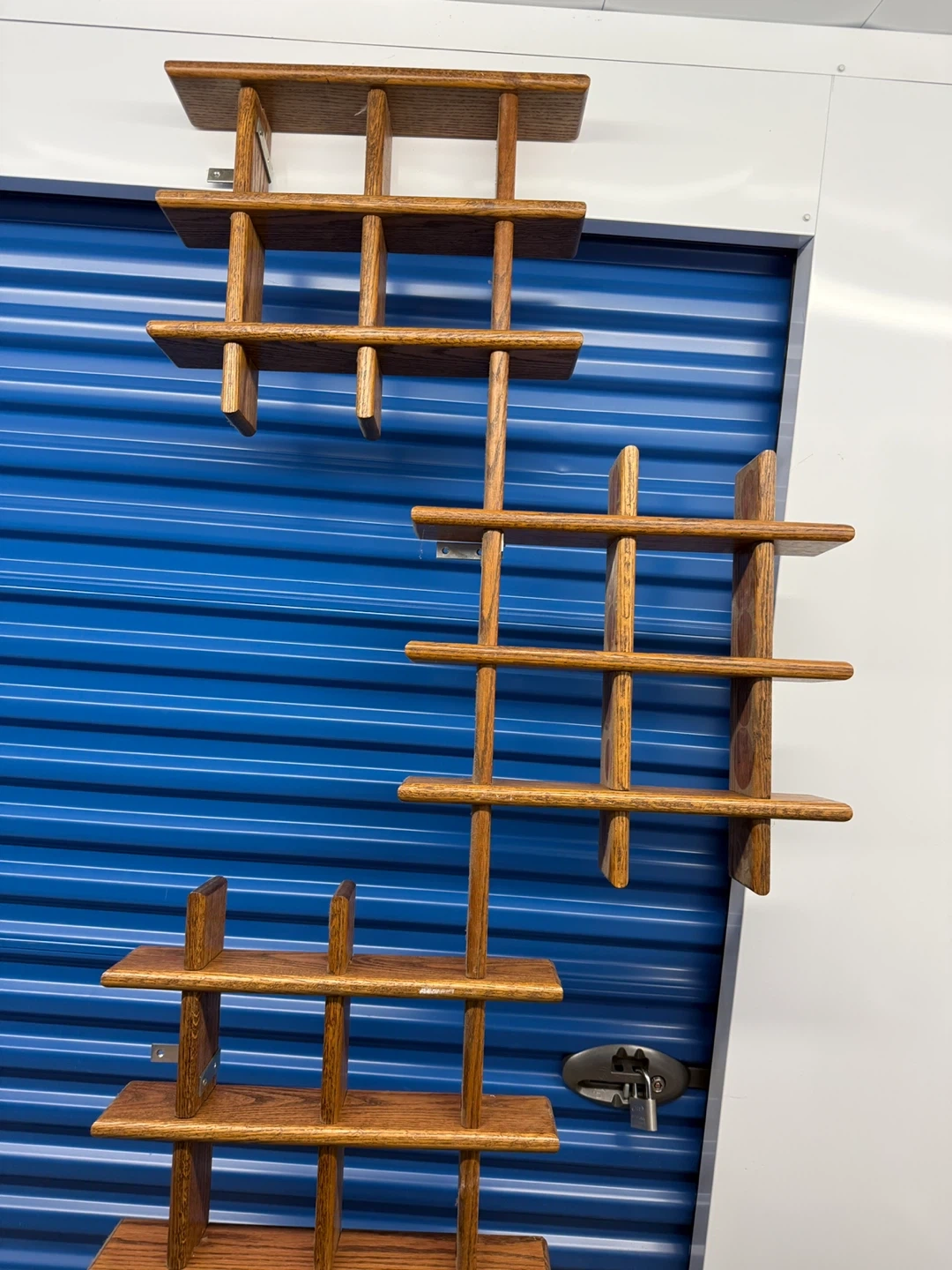 A set of three wooden wall shelves with a grid-like design. These shelves are made of wood and have a warm, brown finish. They're perfect for displaying small decorative items, plants, or books.