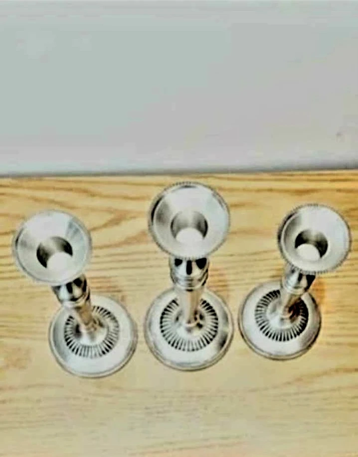 Add a touch of classic elegance to your home with this Solid Brass , Pewter Finished set of three vintage candlesticks, complete with a snuffer.