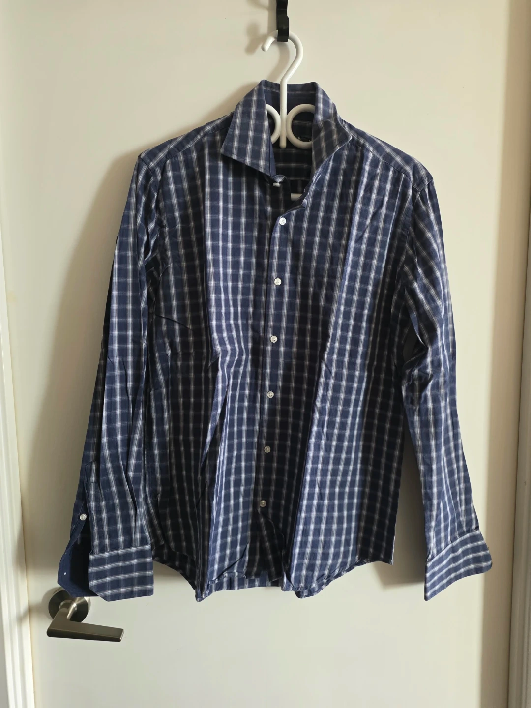A men's long sleeve dress shirt with a blue and white plaid pattern. It's a classic button-up style with a pointed collar. This shirt is suitable for smart casual or professional wear.
