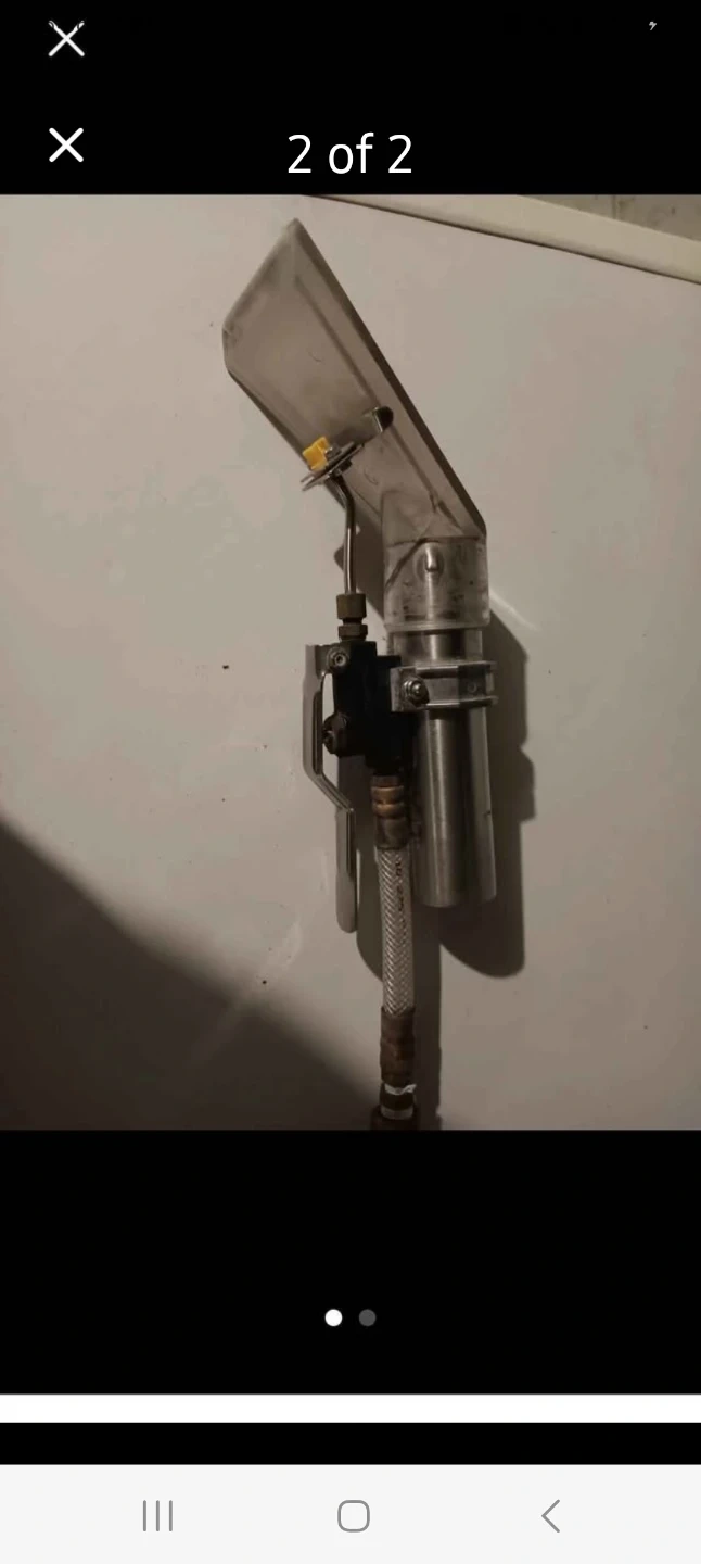 This is a chrome upholstery cleaning tool attachment for a carpet cleaner or extraction machine. It has a clear plastic nozzle at the front and a metal spray nozzle. It includes a hose connection.