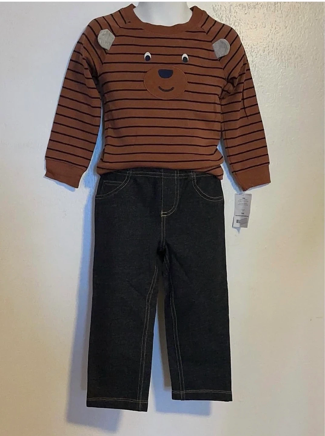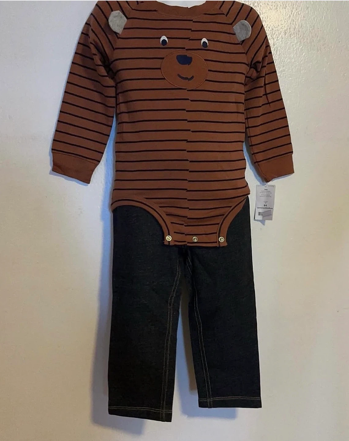 This adorable Carter's outfit is perfect for your little one! The set includes a brown striped, long-sleeve shirt with a bear face and dark denim-look pants. It's new with tags and is ready for your little one !!