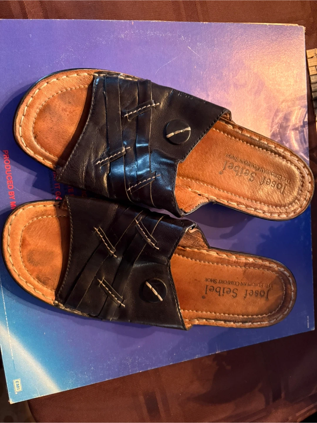 Josef Seibel slip-on sandals in black. Leather upper and lining with a European comfort sole. Marked size 38. (Size 7)
