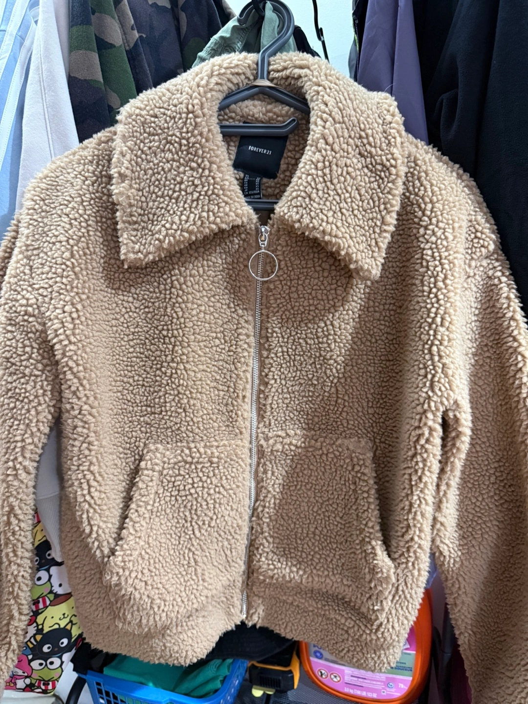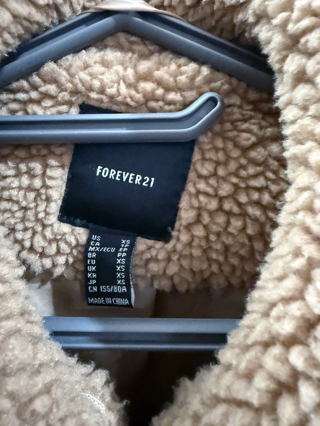 Cozy Forever 21 teddy jacket in size XS! It's a light beige colour and super soft. Perfect for layering during the cooler months. It features a zip-up front and two pockets.