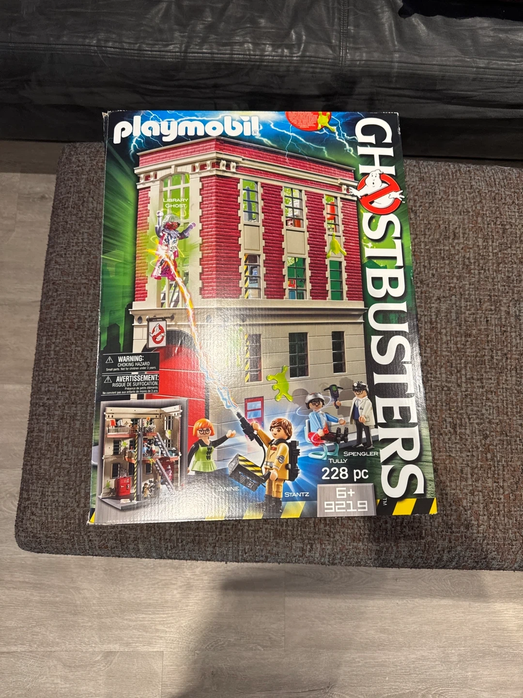 This is the Playmobil Ghostbusters Firehouse set with 228 pieces. It includes figures like Stantz, Spengler, and Tully. This playset is recommended for ages 6 and up. Might be missing some pieces.
