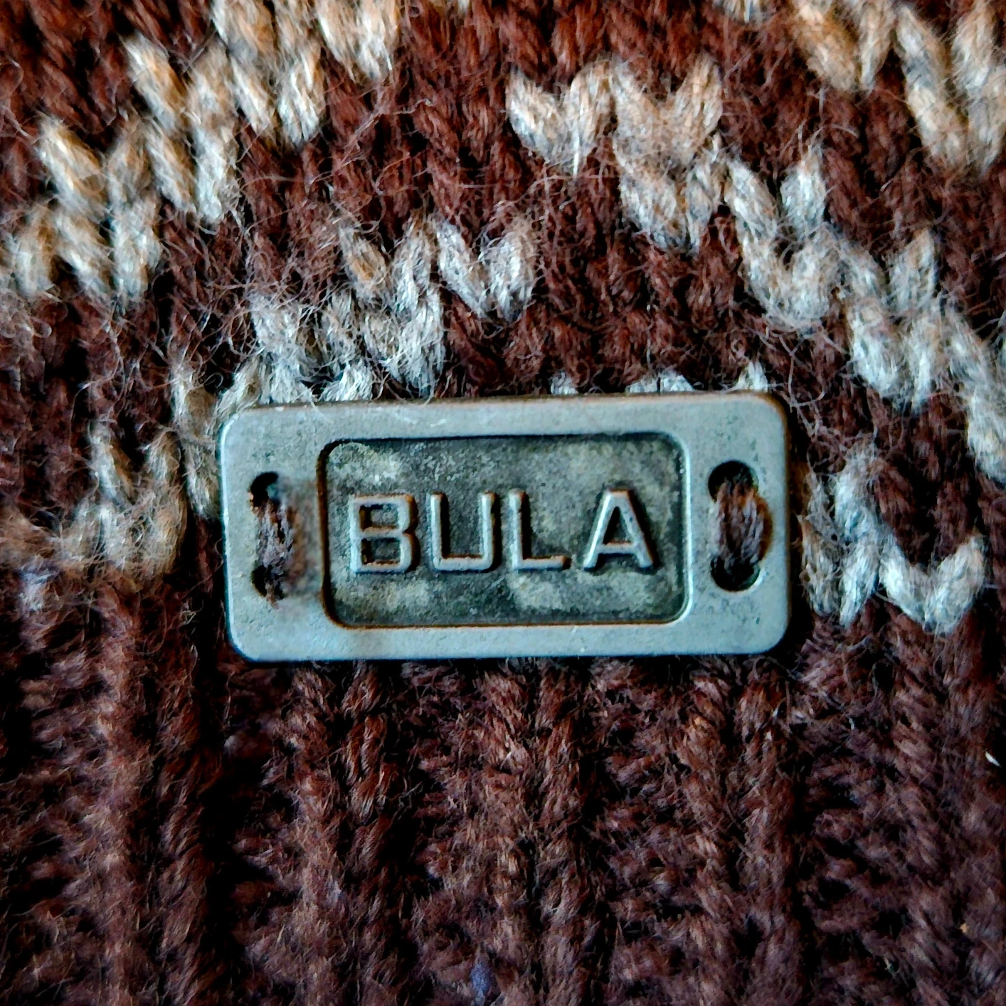 BULA knit hat featuring a brown and white zigzag pattern. It's made in Canada. This toque is great for keeping warm on cooler days!