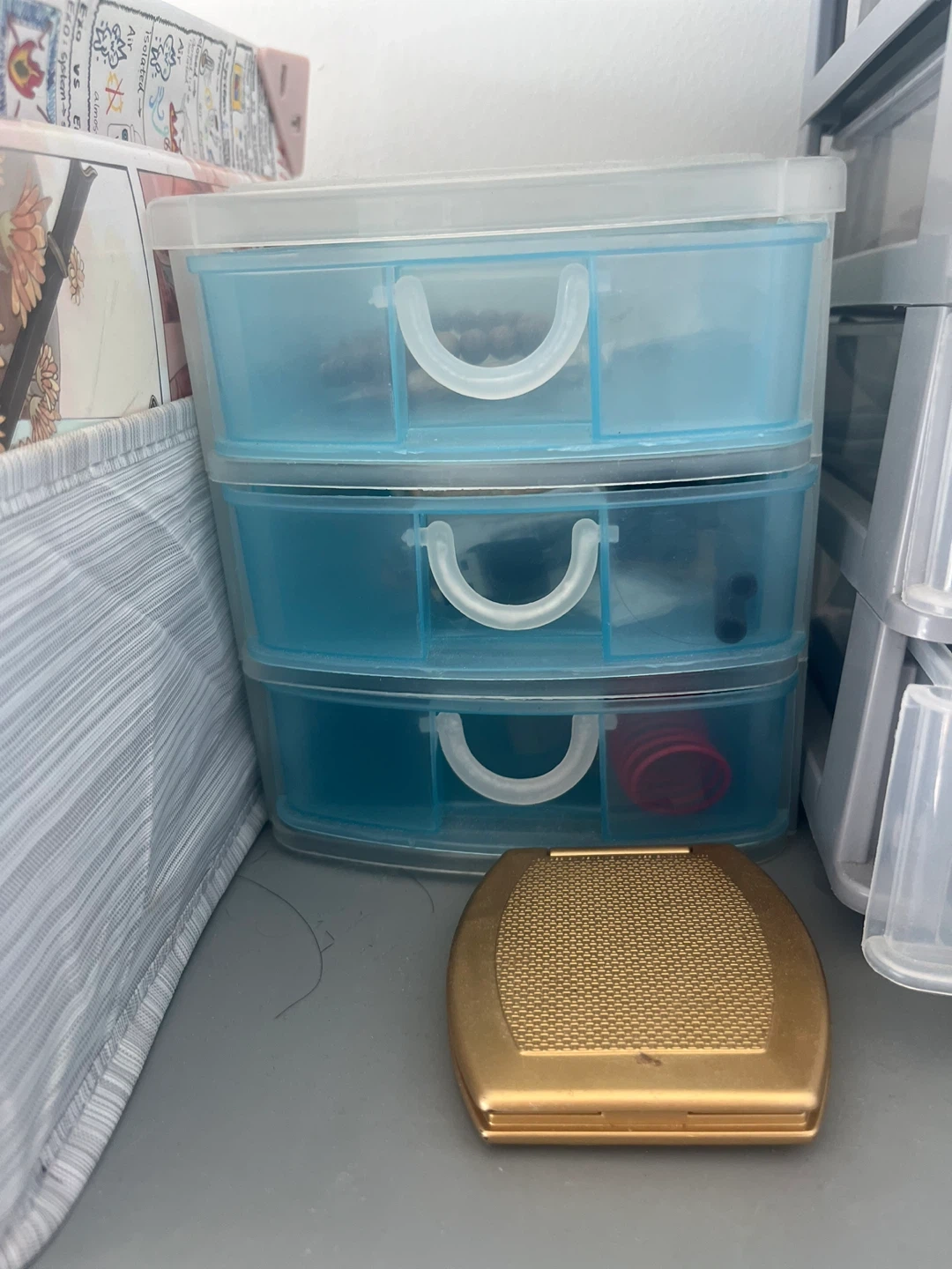 This is a handy 3-drawer plastic organizer. It's great for small items like craft supplies or hardware. Its clear blue drawers make it easy to see what's inside. You can use this for storing beads, small tools, or office supplies.