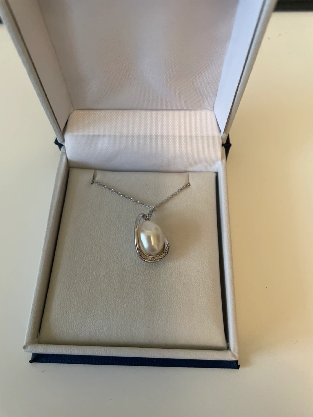 This necklace features a lustrous pearl pendant set in a silver-toned frame, suspended from a delicate silver chain. It comes presented in a blue gift box, ready for gifting or safekeeping. This piece adds a touch of classic elegance to any outfit.