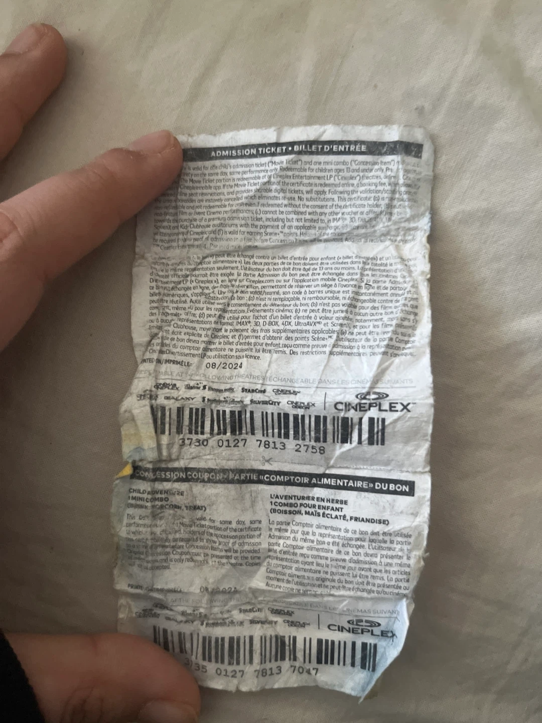 This ticket includes child admission and a mini combo. The mini combo includes a drink, popcorn, and a treat. Very wrinkled but still works. No expiry date. You can scan at at CINEPLEX.
