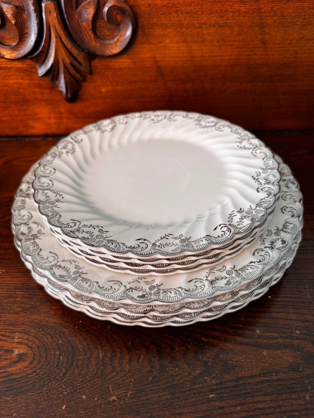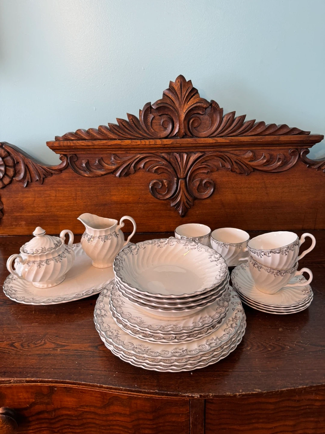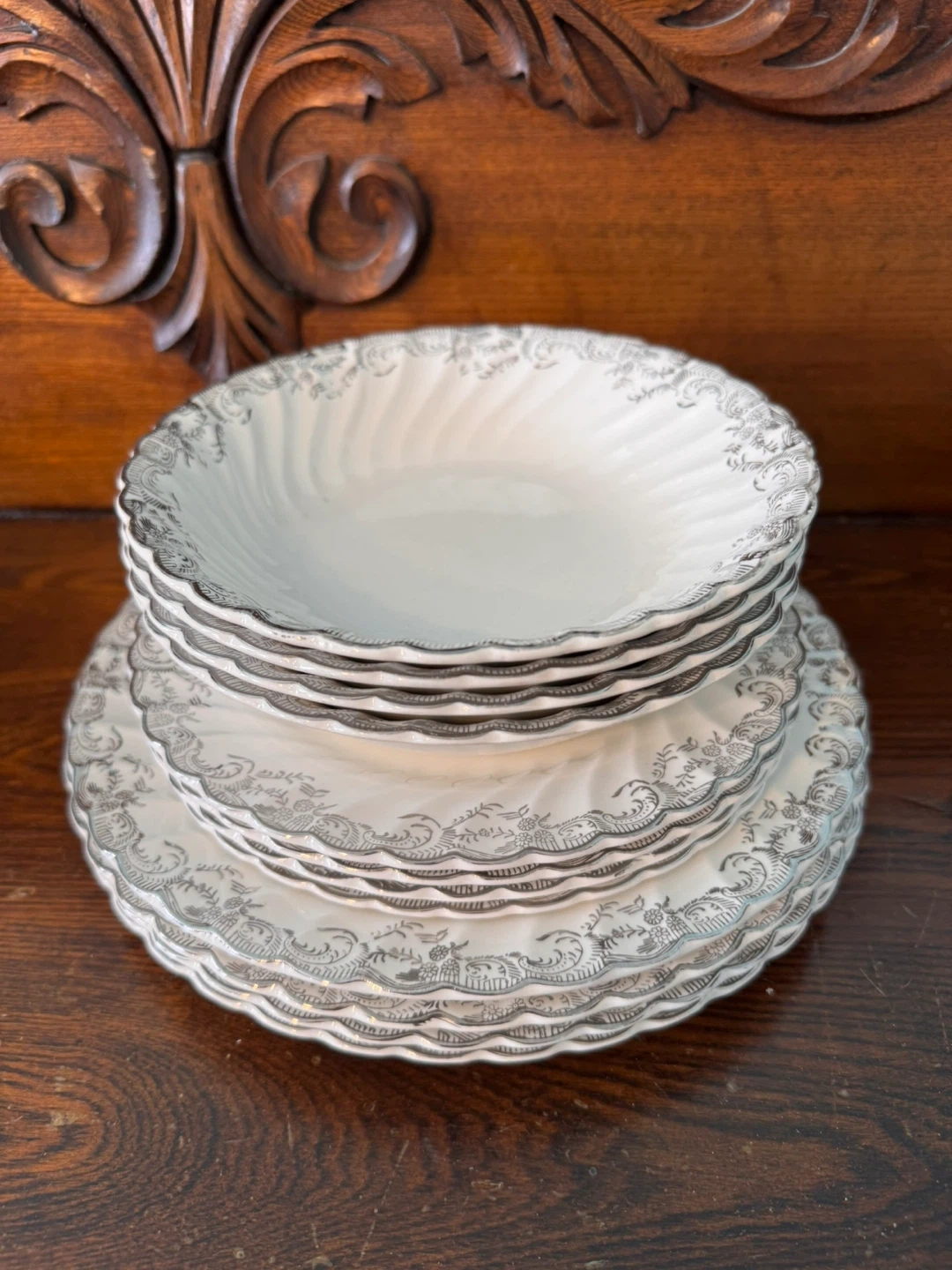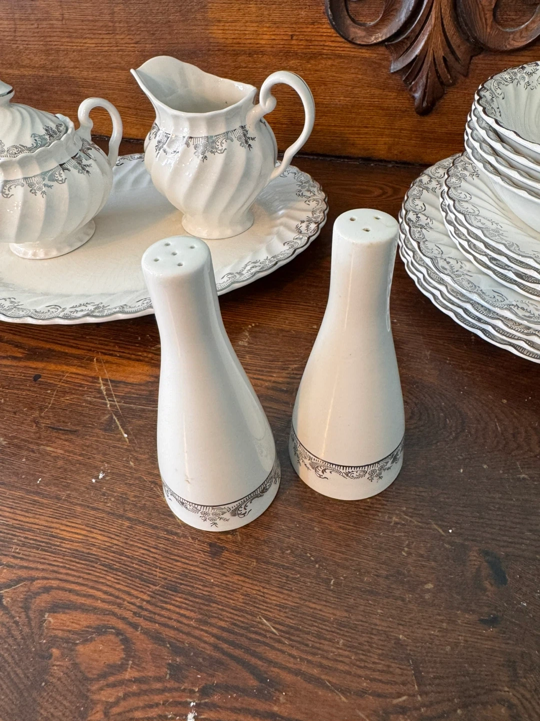 A classic 50’s Johnson Bros Snowwhite Regency dinner set. Includes 4 dinner plates, 4 appetizer plates, 4 soup bowls, 4 tea cups & 4 saucers, 2 small condiment plates, a sugar bowl, creamer, and salt / pepper shakers. Made in England from durable ironstone. Cute silver detailing.