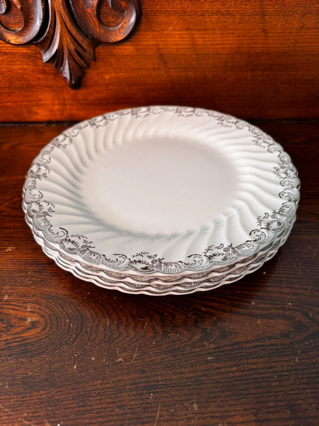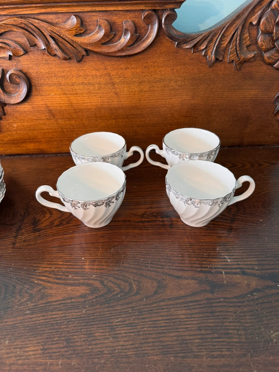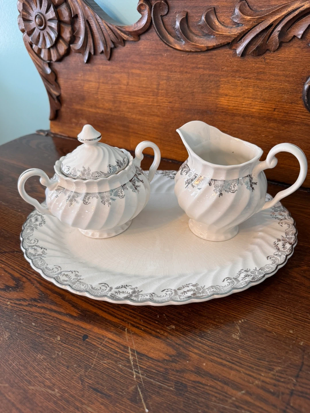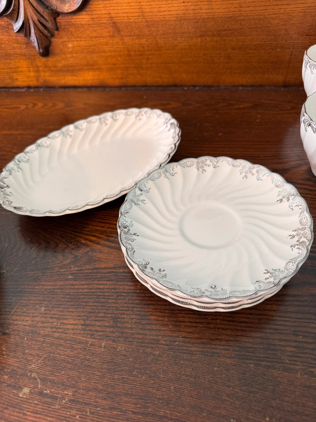 A classic 50’s Johnson Bros Snowwhite Regency dinner set. Includes 4 dinner plates, 4 appetizer plates, 4 soup bowls, 4 tea cups & 4 saucers, 2 small condiment plates, a sugar bowl, creamer, and salt / pepper shakers. Made in England from durable ironstone. Cute silver detailing.