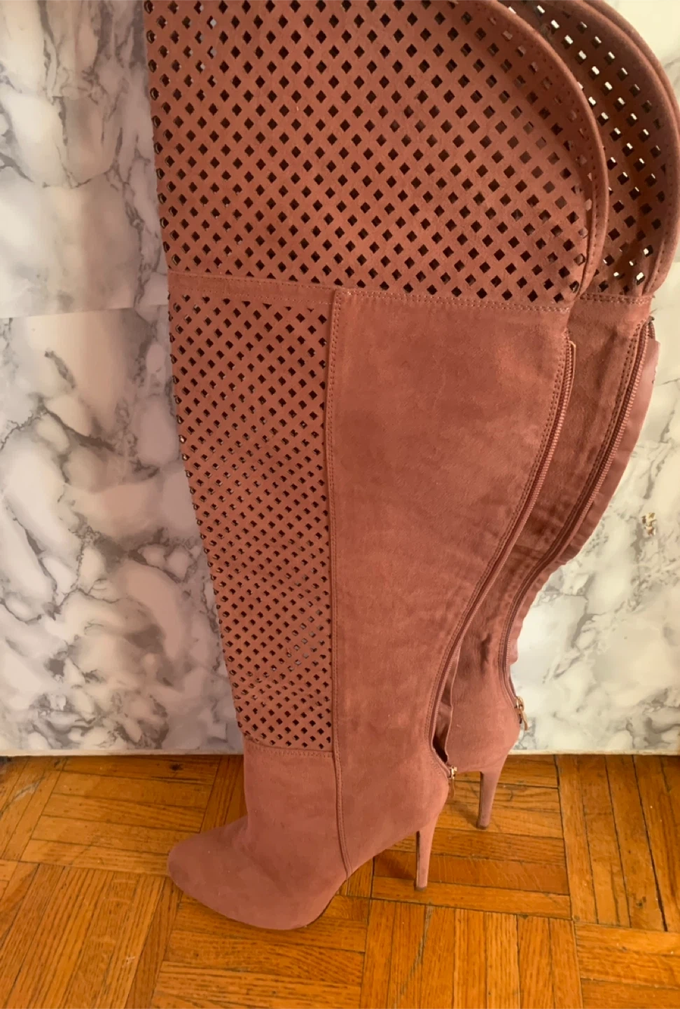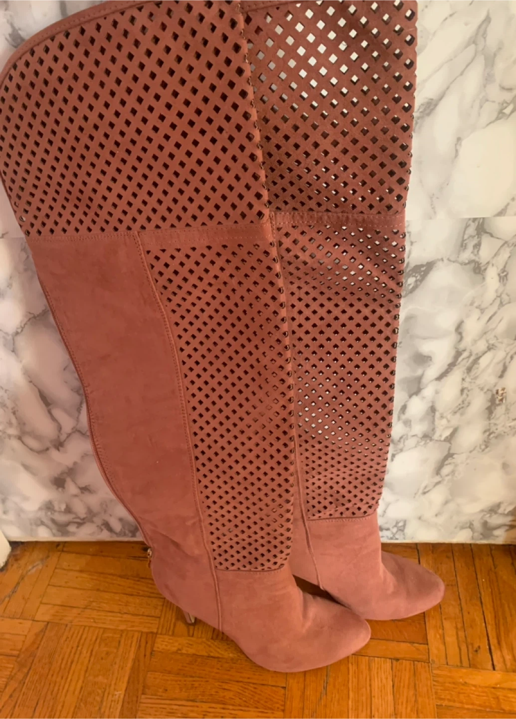 These stylish dusty rose boots go over the knee. They feature a perforated pattern up the shaft and a side zipper for easy on and off. The material appears to be faux suede.