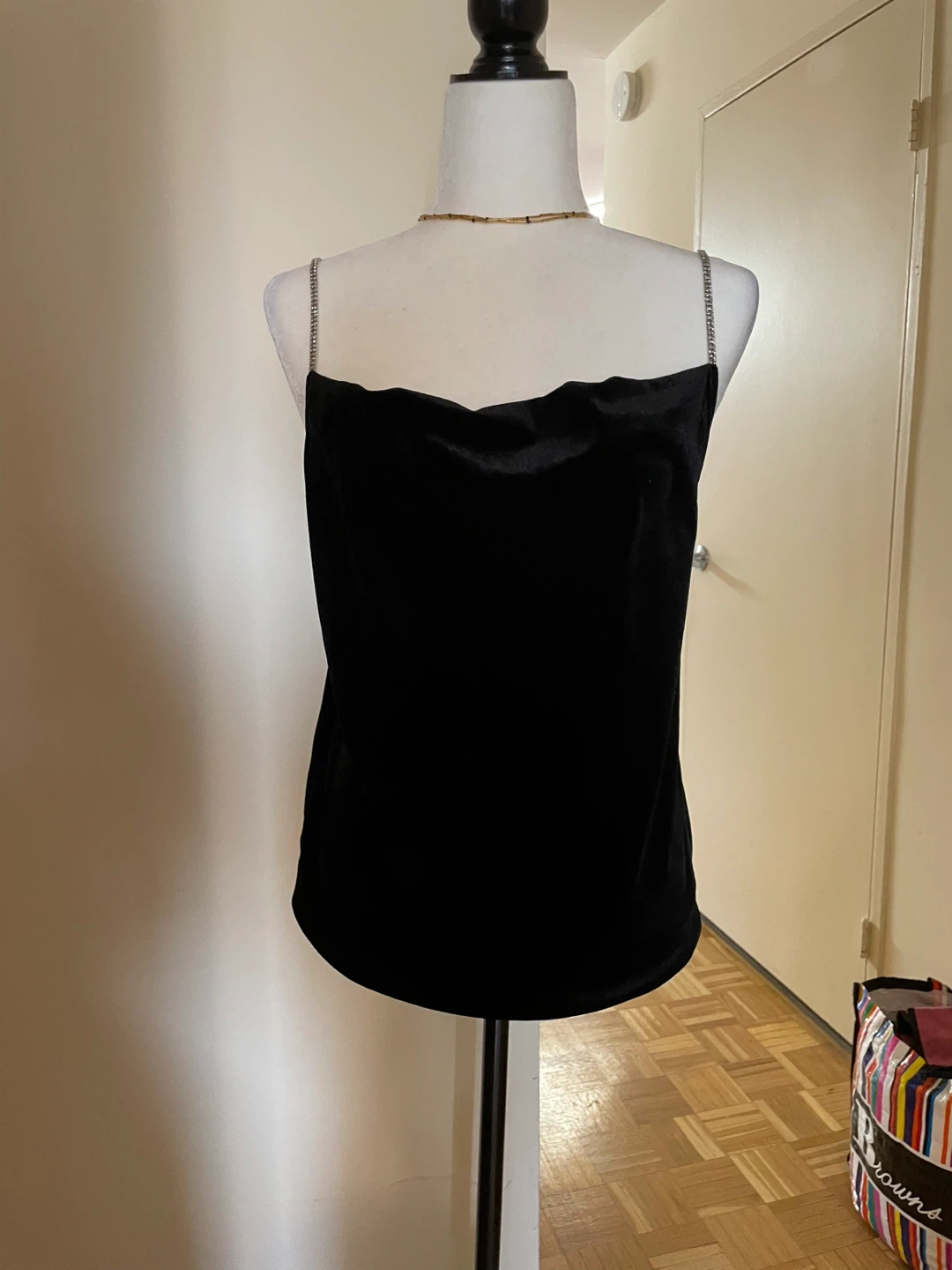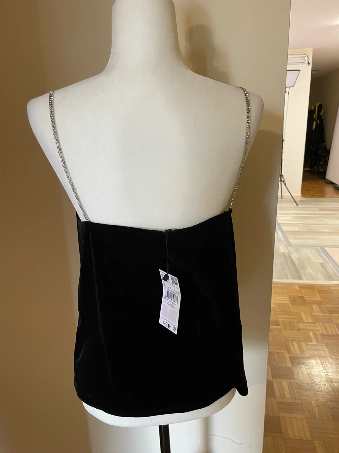 MANGO black velvet cami features sparkly rhinestone straps for a touch of glam. It's a stylish piece for a night out. The material is soft and has a nice drape.