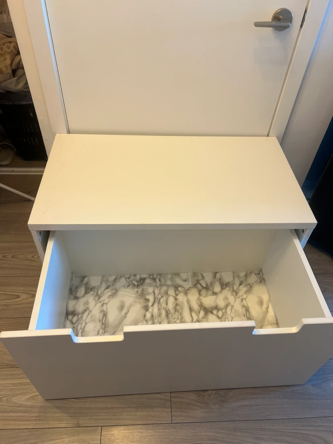Selling a white bench with storage. It's in good condition and perfect for keeping things organised while providing ample space to sit on it.