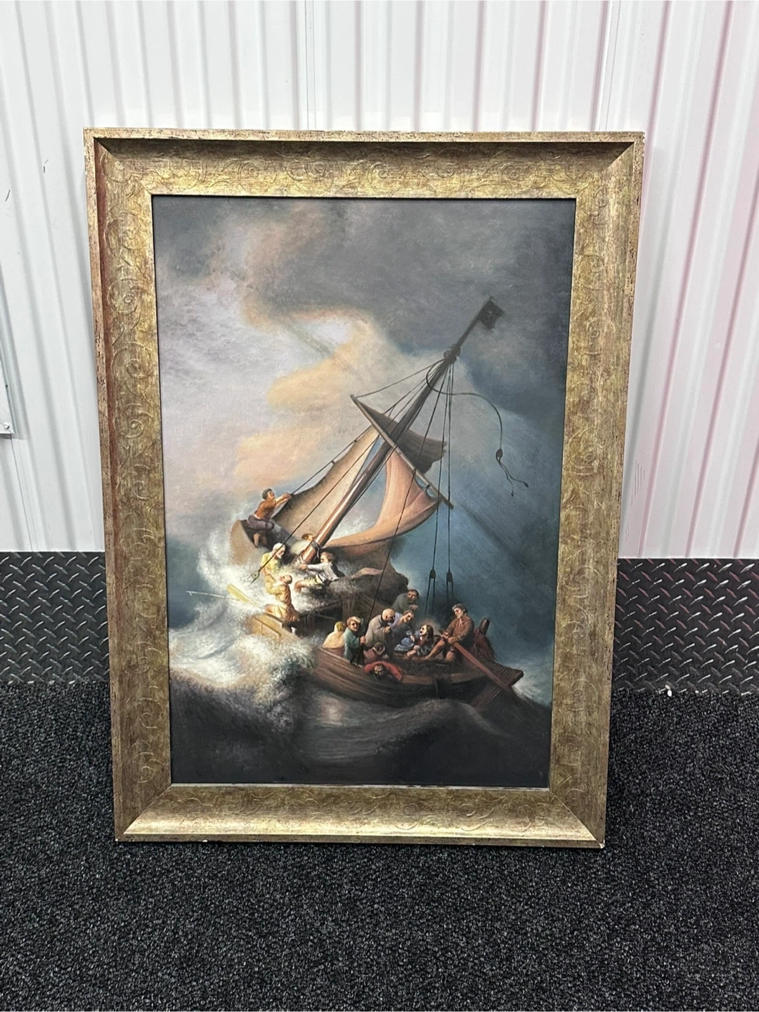 This framed art print depicts "The Storm on the Sea of Galilee." The frame is distressed gold with ornate detailing. There are some chips and wear on the frame's corners.