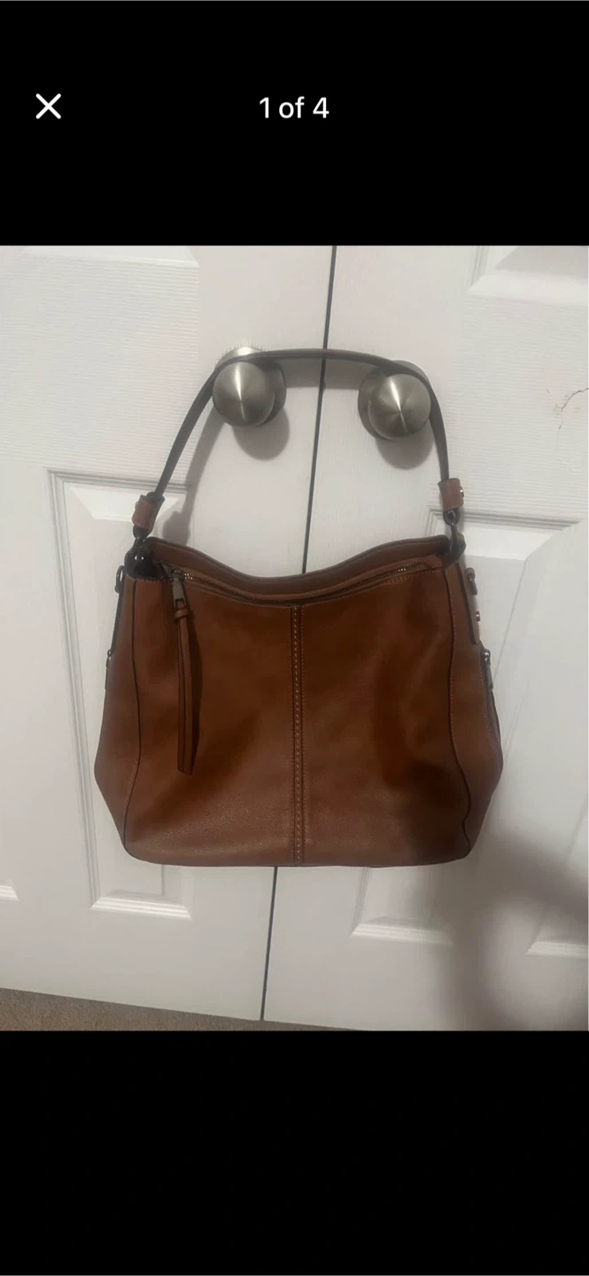 This brown hobo shoulder bag has a gold-tone hardware finish and a faux leather exterior. It features a zippered main compartment with an interior zip pocket and two slip pockets. The bag comes with both a shoulder strap and an adjustable crossbody strap. Perfect for everyday use!
