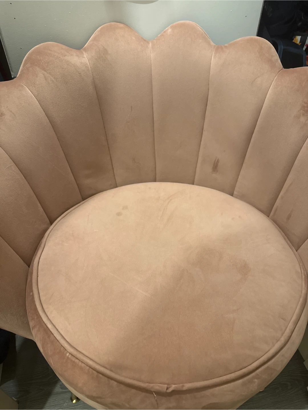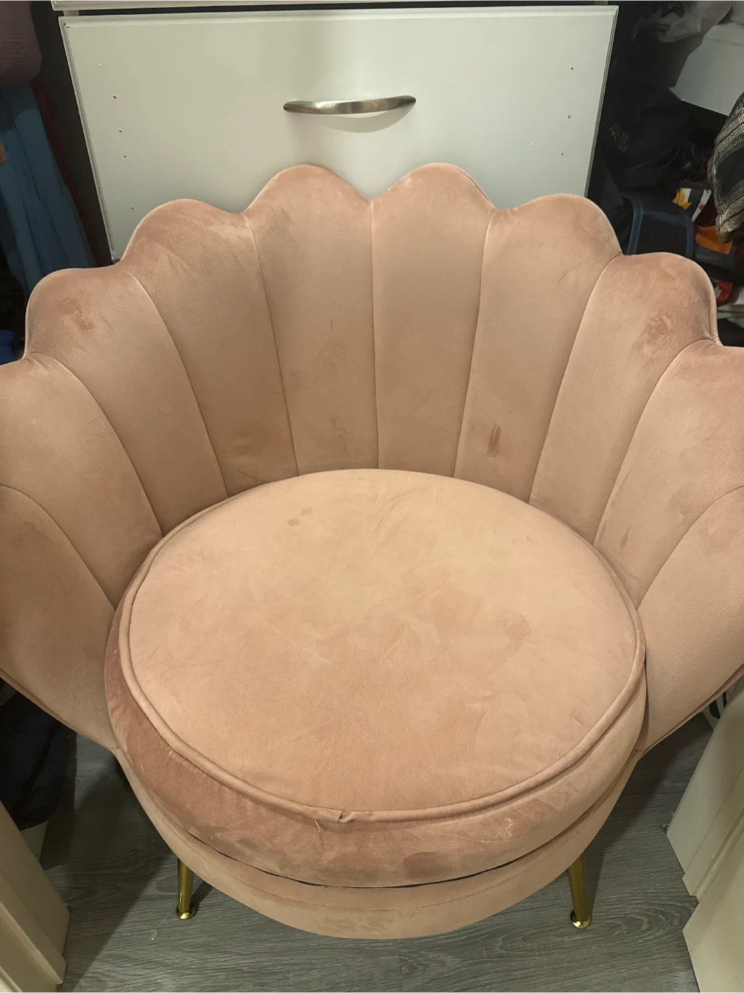 A lovely pink velvet accent chair with a unique shell design. It's upholstered in soft velvet material. This chair adds a stylish touch to any room!