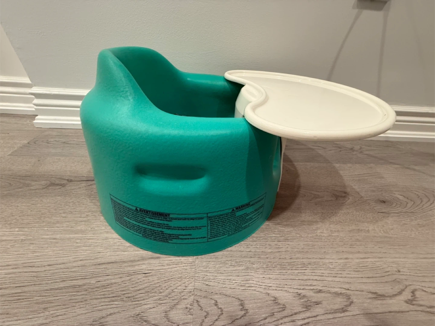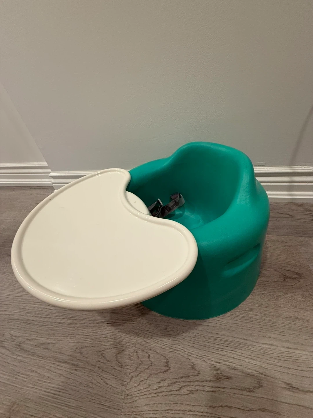 Comfy Bumbo floor seat. Is green with white tray. Has safety harness. Great for little ones learning to sit up. It comes with a detachable tray for snacks and toys. Easy to clean. Lightly used, pet-free and smoke-free home.