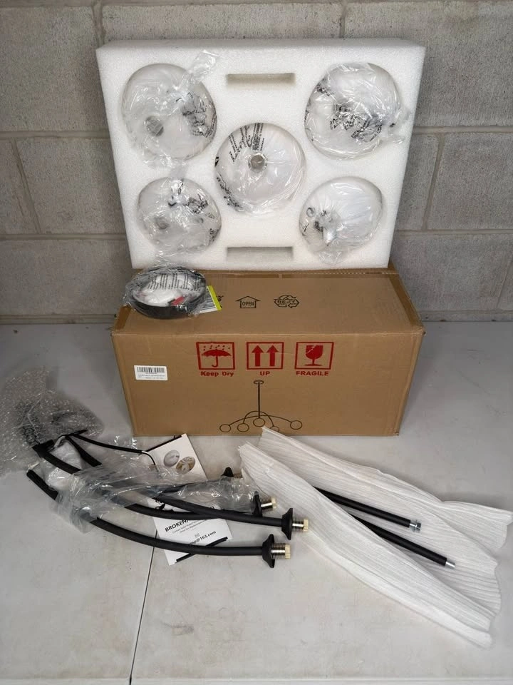 This modern black chandelier features five spherical glass shades with outward-extending arms for balanced, radiant lighting. Adjustable hanging height and sloped-ceiling compatibility make it ideal for dining rooms, living spaces, kitchens, or foyers, delivering a sleek mid-century look with strong light transmission.
