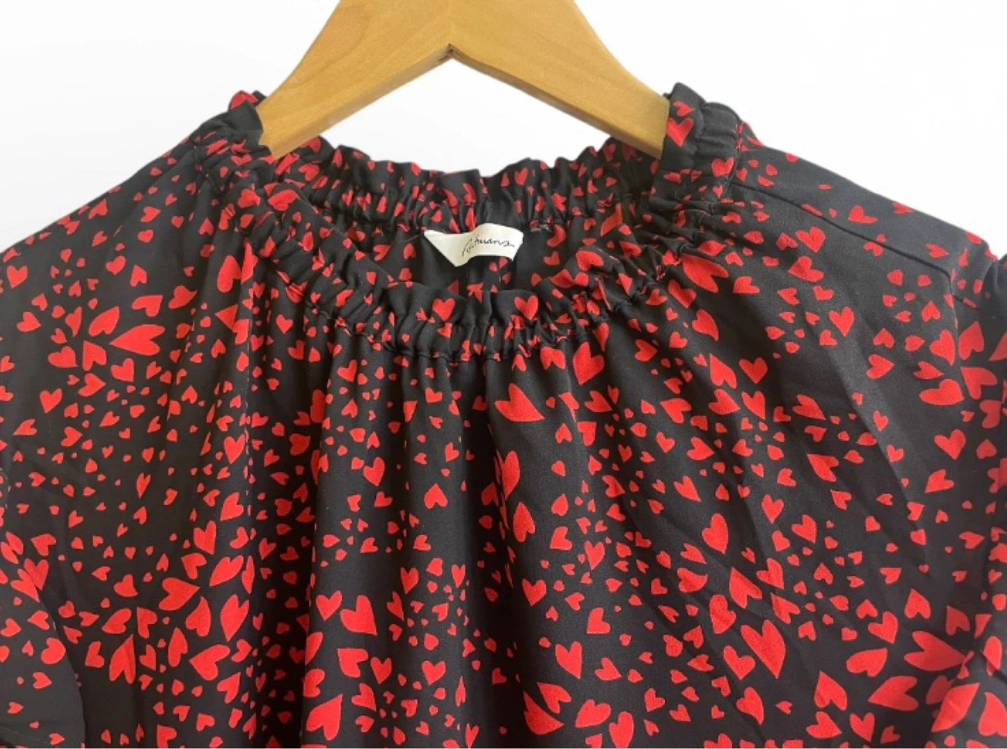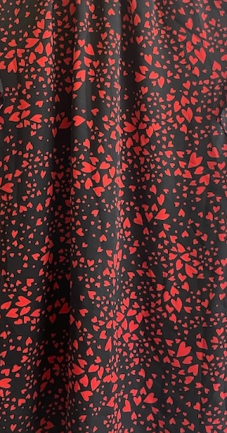 Black with red hearts pattern — super cute for Valentine’s Day and beyond. Elegant detailing at neckline and shoulder.