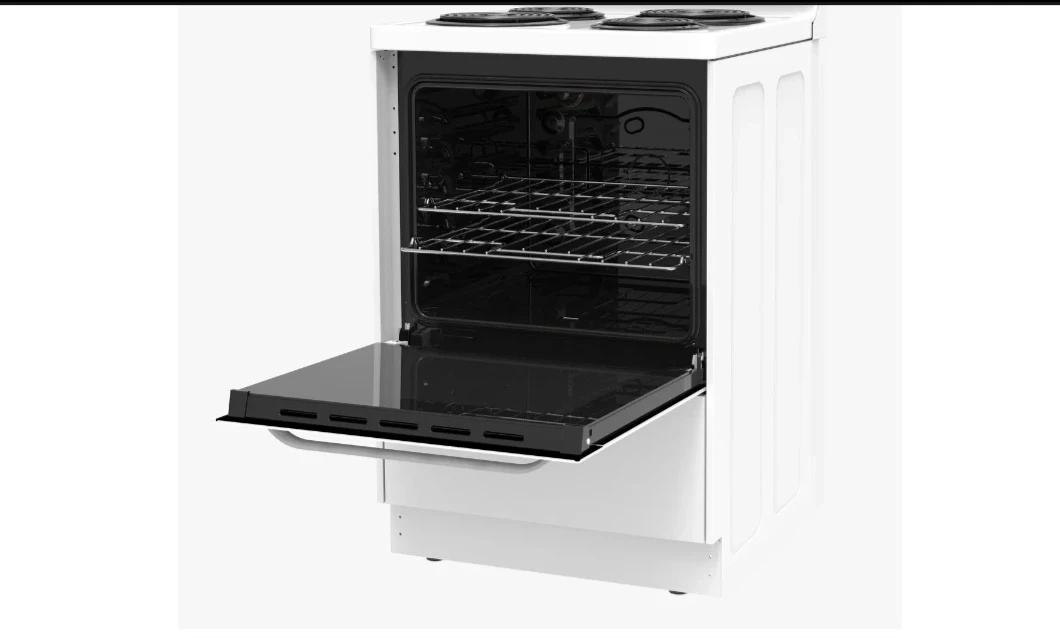 This is a white electric stove with a four-burner cooktop and a built-in oven. The oven includes two racks for baking and roasting. It's a standard appliance for your kitchen.