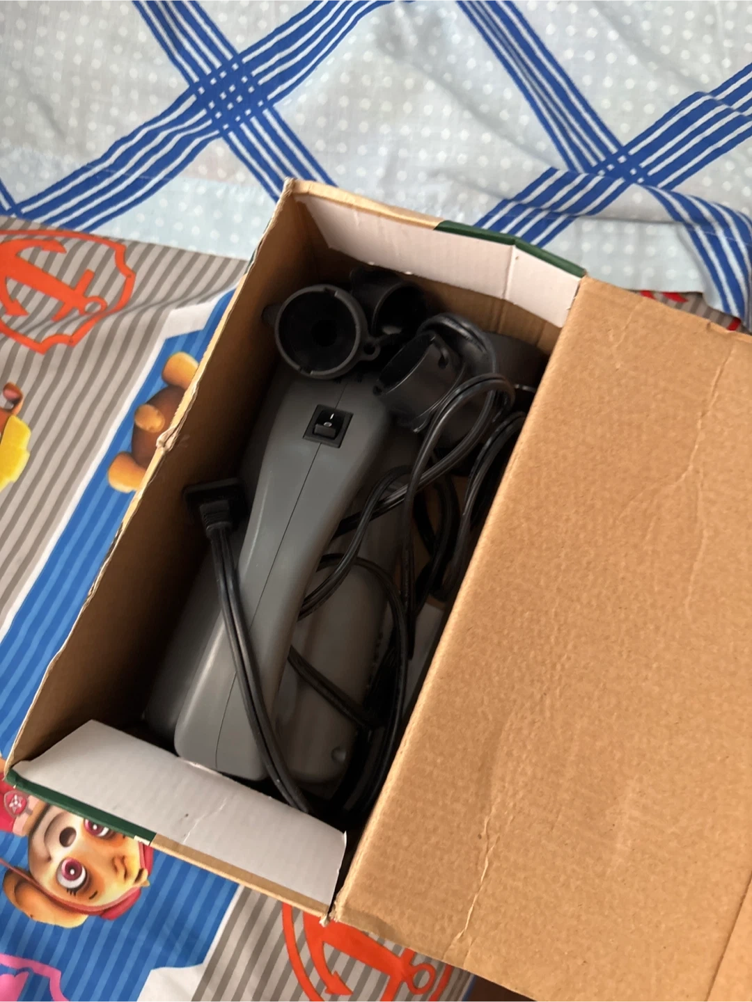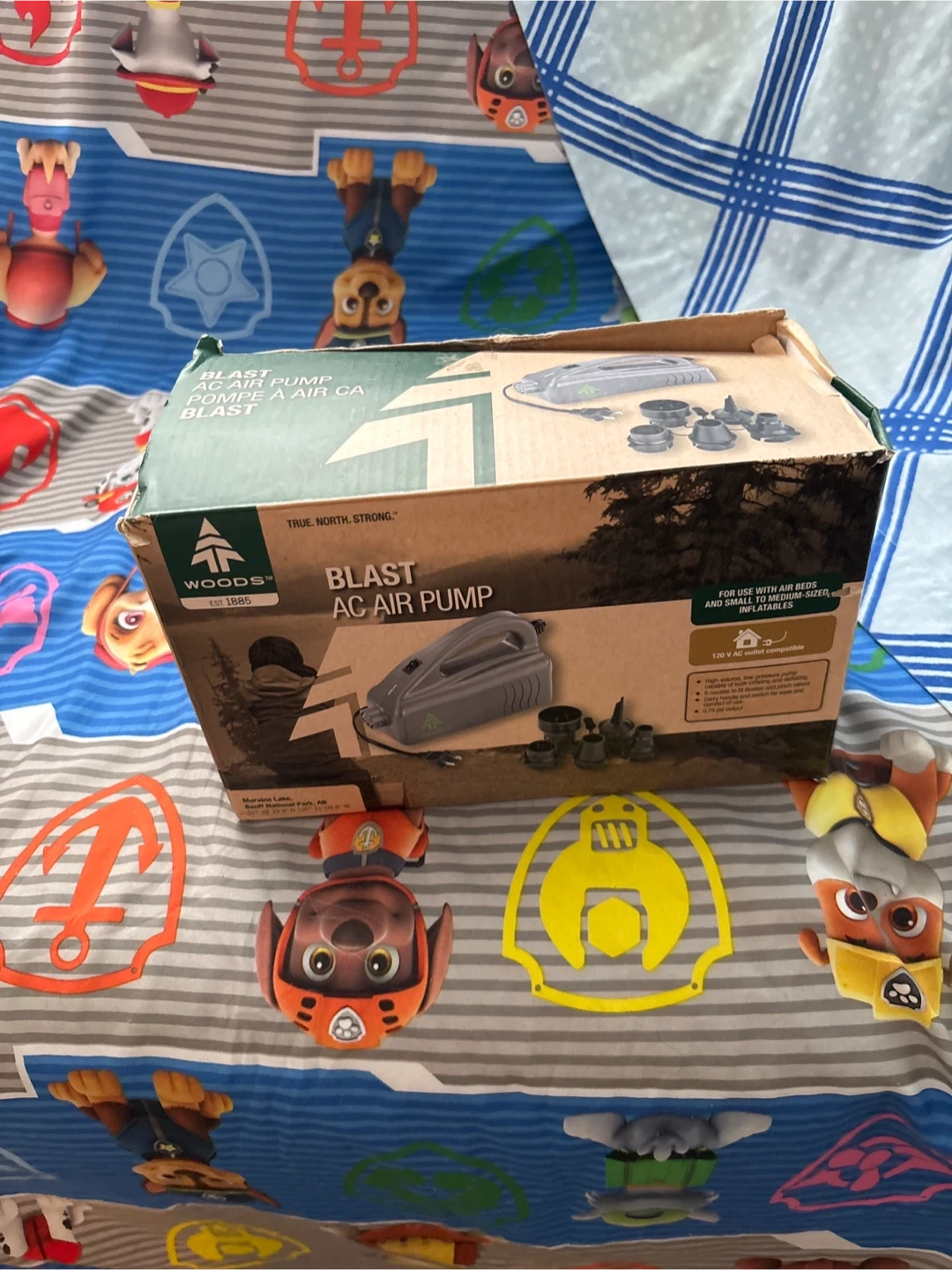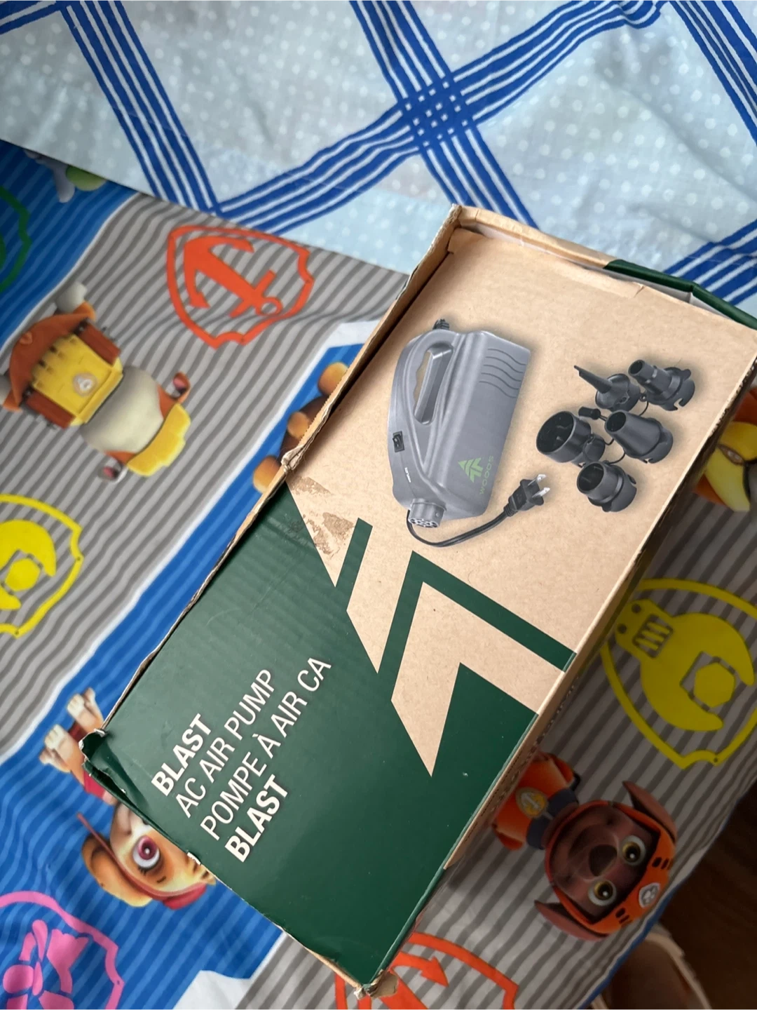 Woods Blast AC air pump. It's grey and includes multiple nozzle attachments for various inflatables. 120V compatible. Useful for air beds and other inflatables!