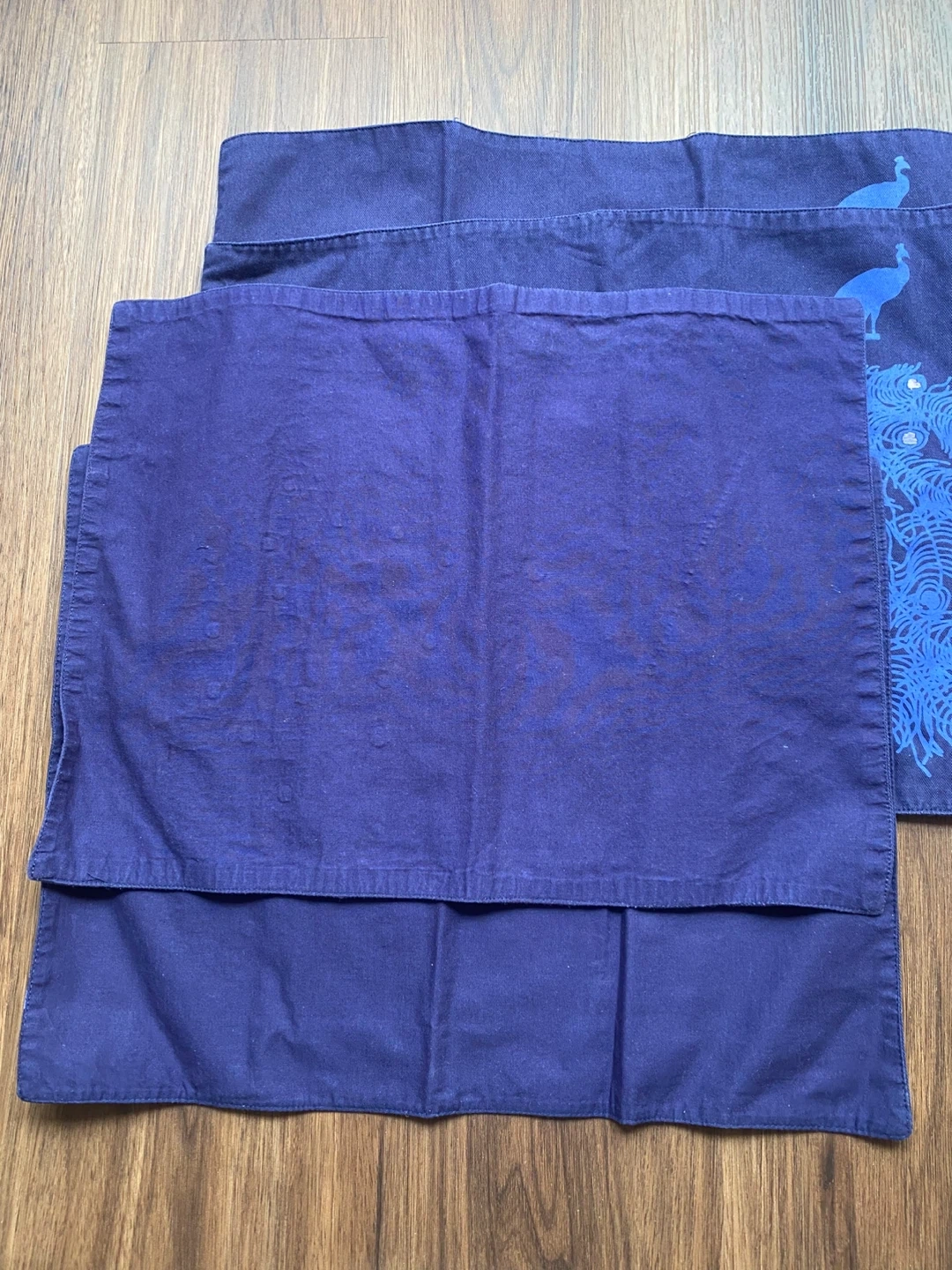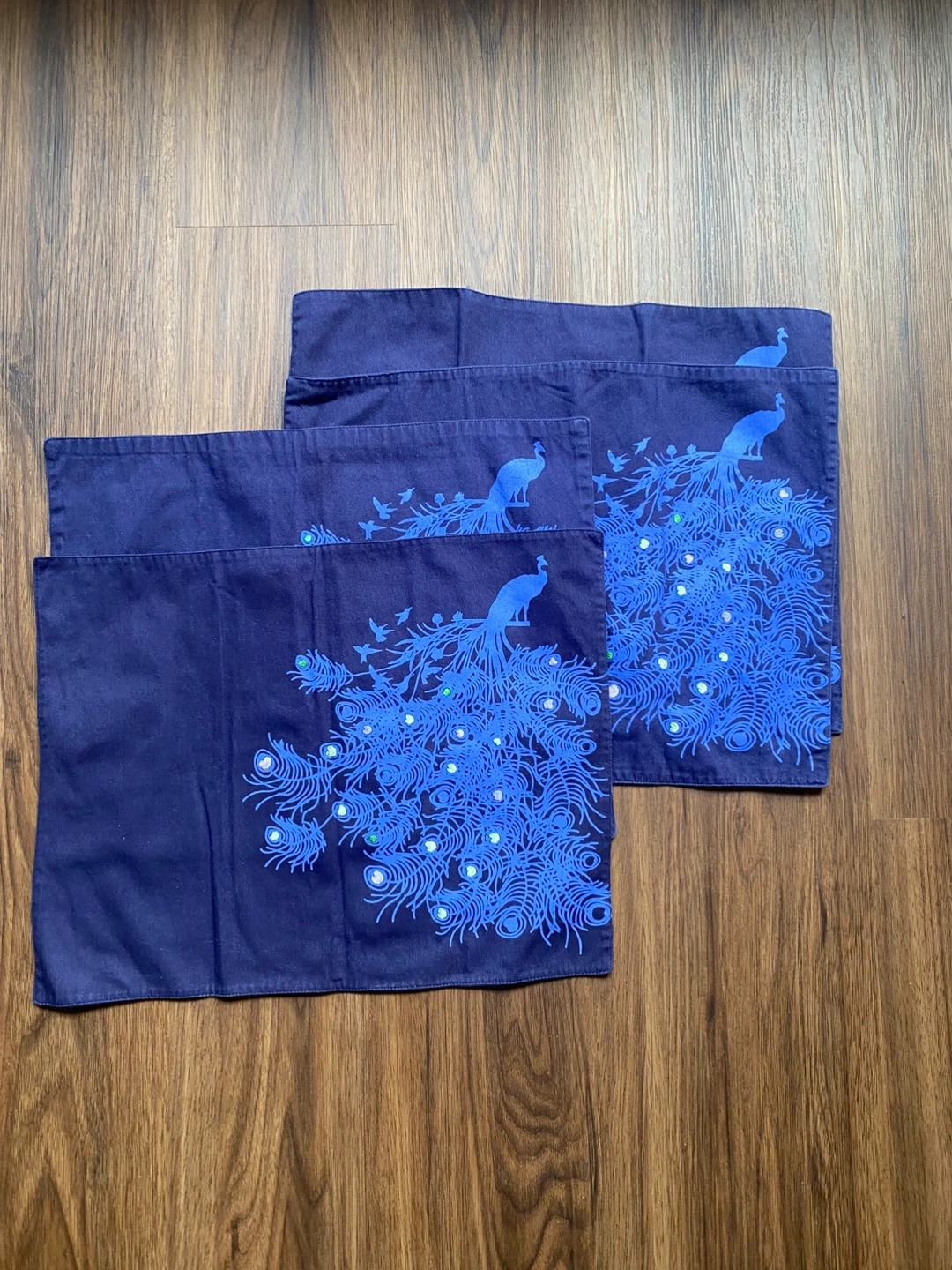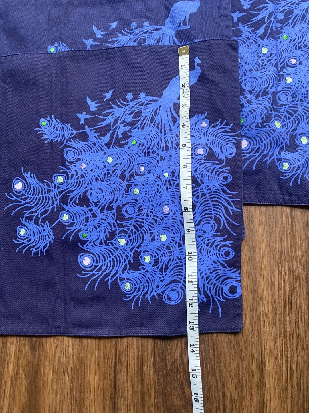 Here's a set of four fabric placemats featuring a beautiful peacock print! They are in great condition and ready to add a touch of elegance to your dining table. The placemats measure approximately 13x17 inches. Washed and stored.