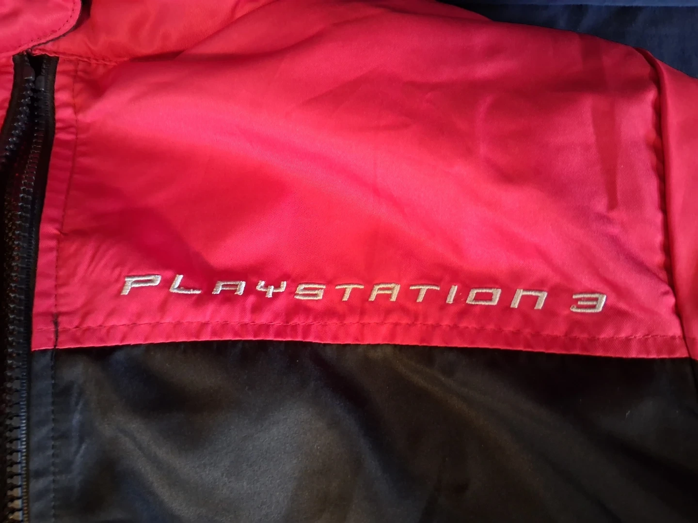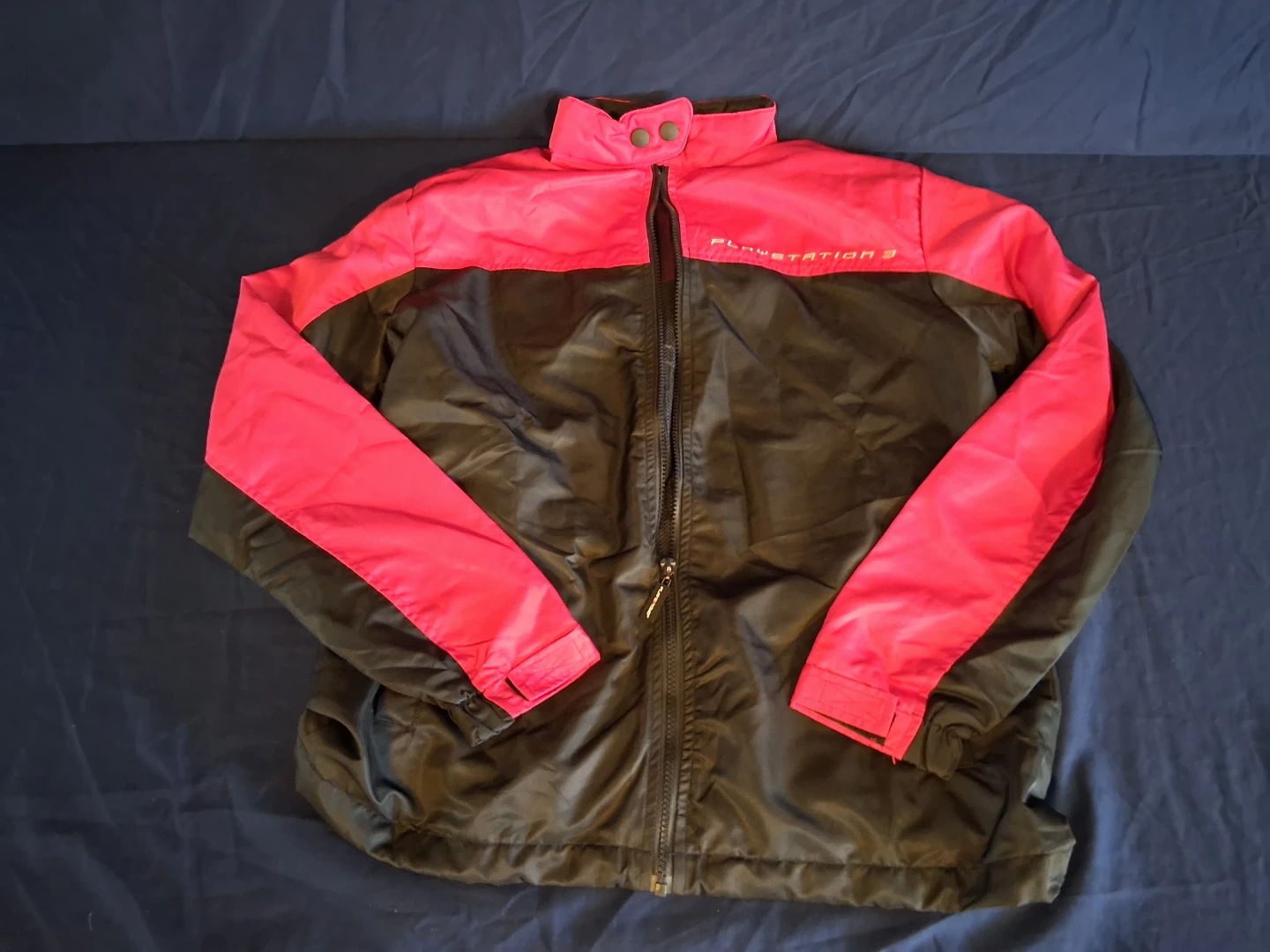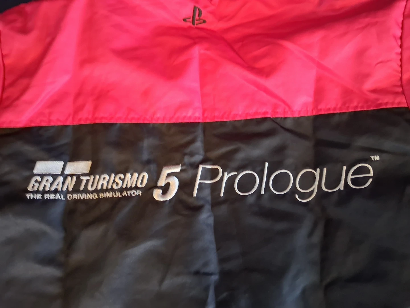 This is a Playstation 3 Gran Turismo 5 Prologue jacket. It's a two-toned jacket in black and bright pink. It has "Playstation 3" embroidered on the front and "Gran Turismo 5 Prologue THE REAL DRIVING SIMULATOR" on the back with the Playstation logo.