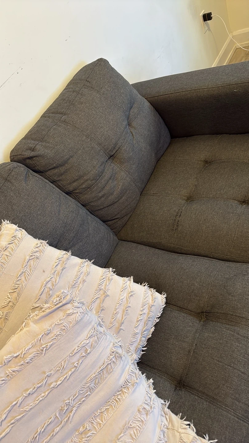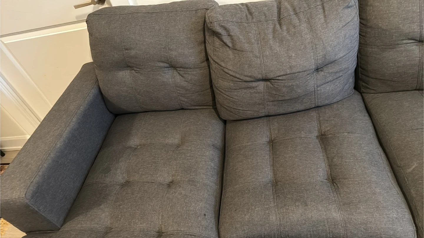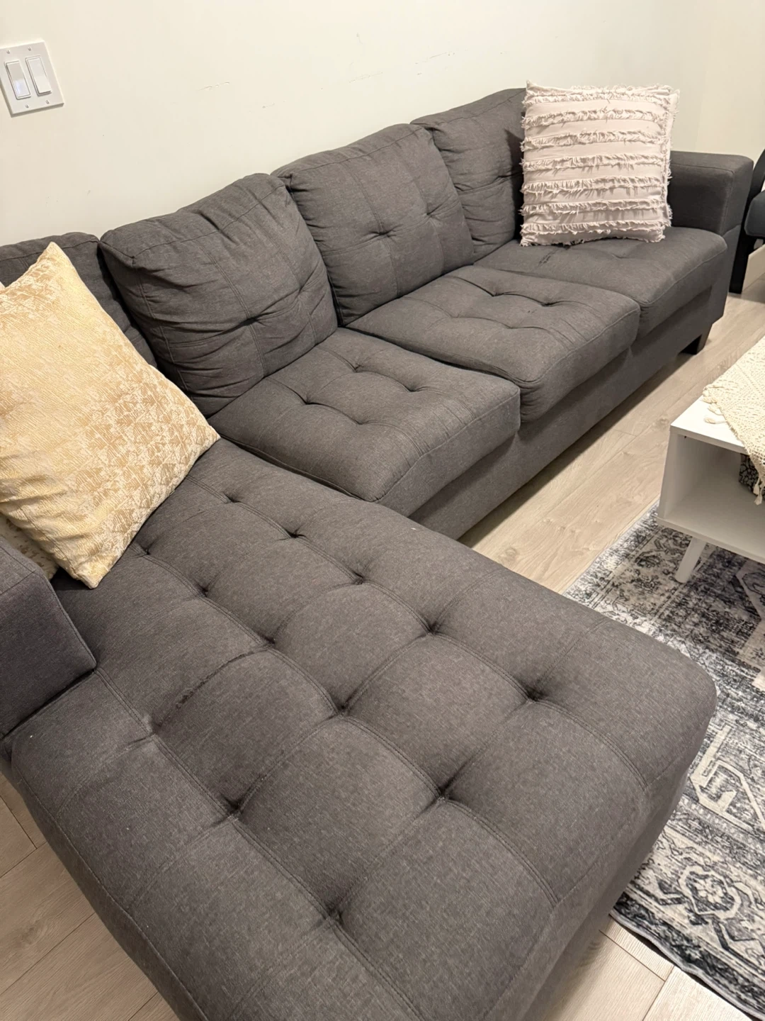 Comfortable grey sectional sofa with a tufted design. It includes a storage ottoman, perfect for stashing blankets or pillows. Offers ample seating for your living space.