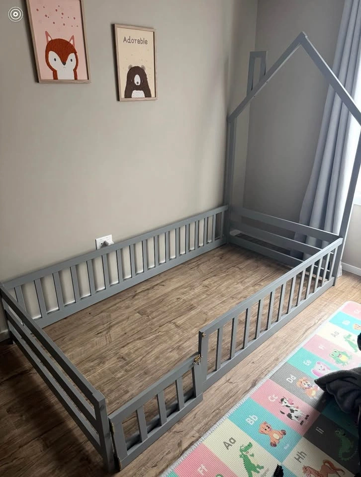 A grey wooden toddler bed frame designed like a house. It includes safety rails to prevent little ones from rolling out. This bed frame's design makes transitioning from a crib easier!