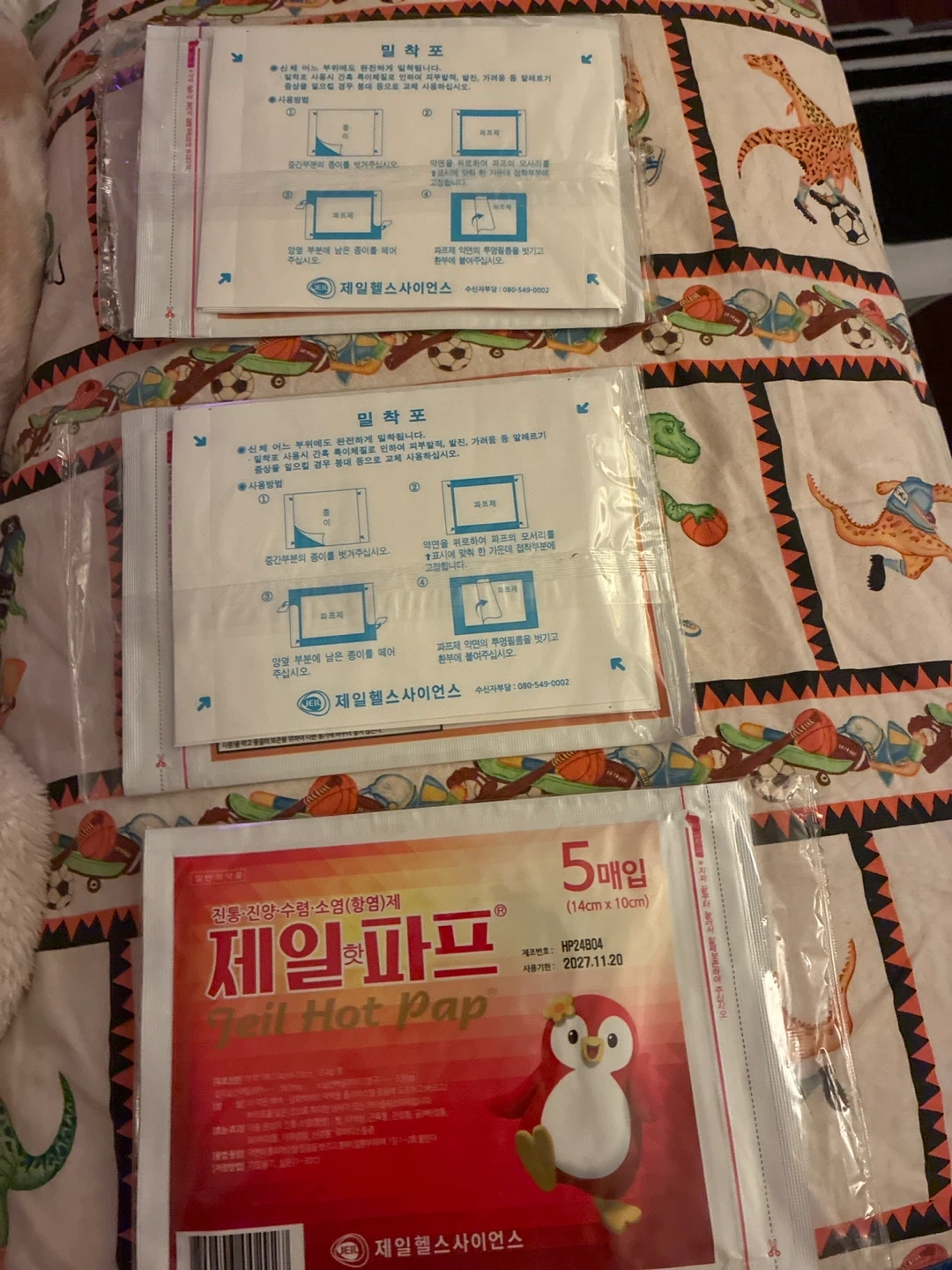 These are Jeil Hot Pap warm packs. Each pack contains 5 individual warmers, measuring 14cm by 10cm. The expiration date is November 20, 2027. They provide soothing warmth.