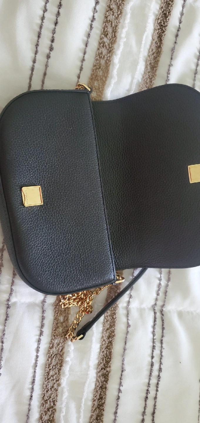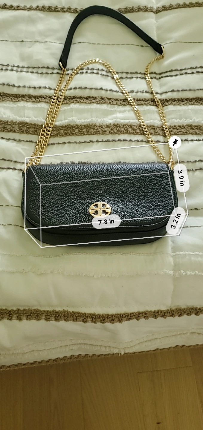 This is a Tory Burch black leather shoulder bag with a gold chain strap. The approximate dimensions are 8 inches wide, 4.4 inches high, and 2.2 inches deep. The bag also features the Tory Burch logo on the front.