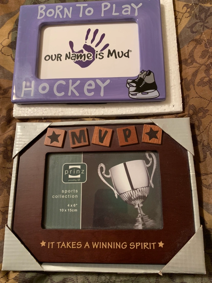 Two picture frames. One is a brown wooden frame with "It takes a winning spirit" written on it. The other is a light purple frame with "Born to play" written on it. $10 each