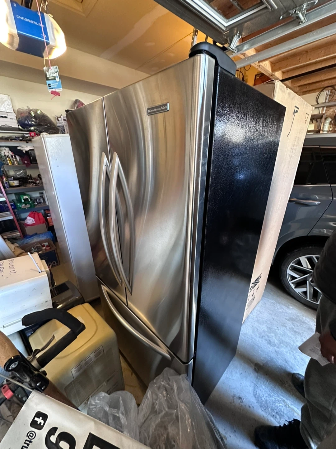 This is a KitchenAid French door refrigerator with a stainless steel finish. It has a black back panel. The unit comes in its original packaging.