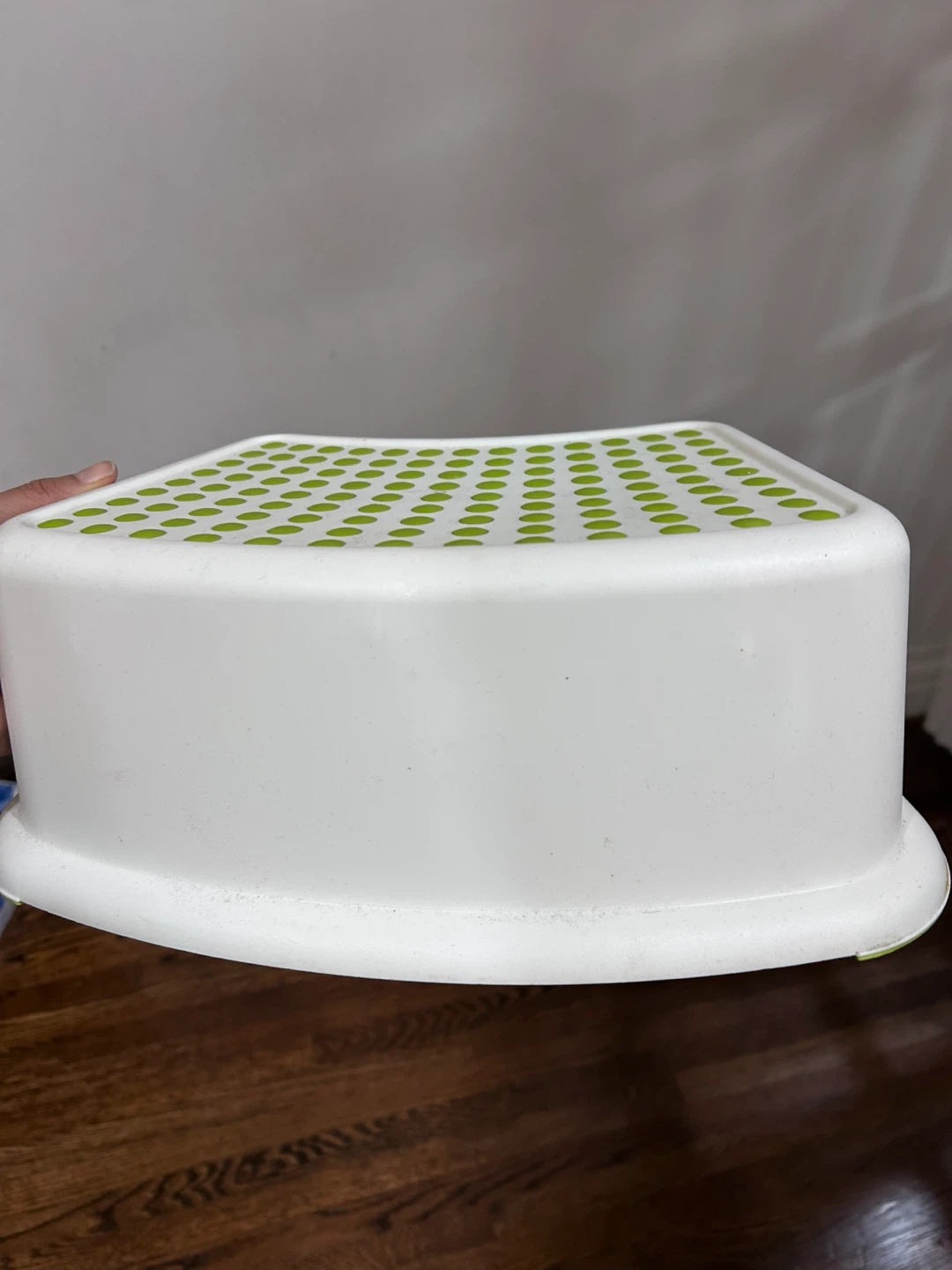 This is a white children's step stool with a green polka dot grip. It's made of plastic and is sturdy for little ones. It's perfect for reaching things on counters or the sink.