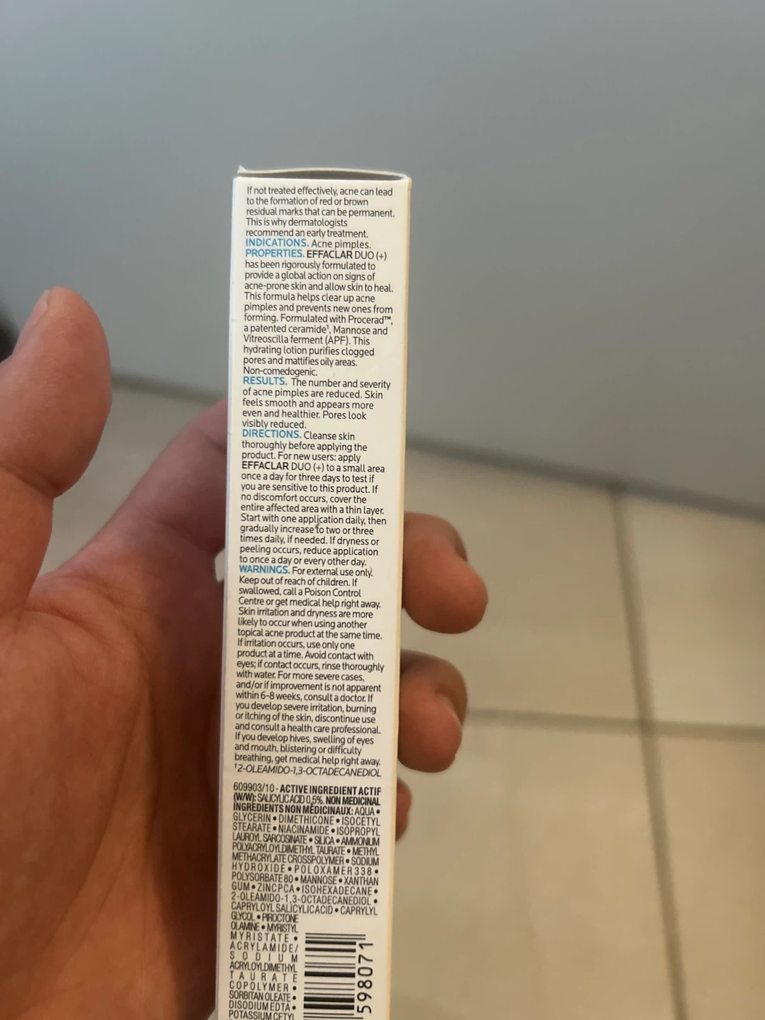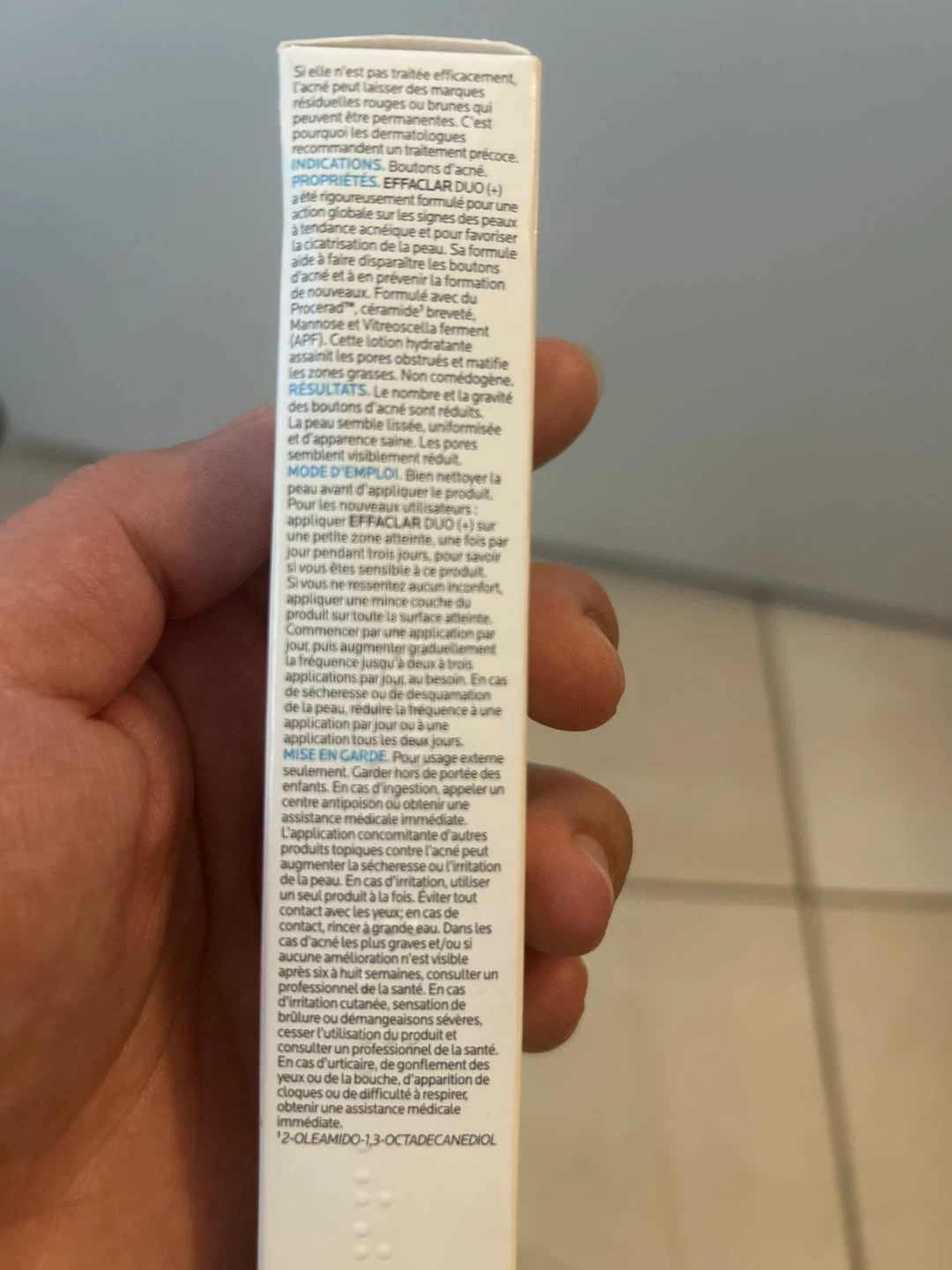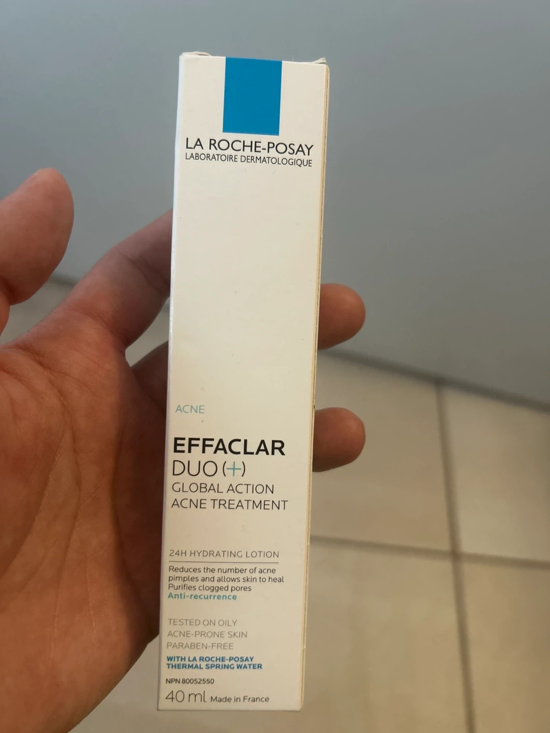 This is La Roche-Posay Effaclar Duo+ global action acne treatment. It's a 24H hydrating lotion that reduces the number of acne pimples and helps skin to heal. It purifies clogged pores and fights recurrence. Expiry date is 11-2026.