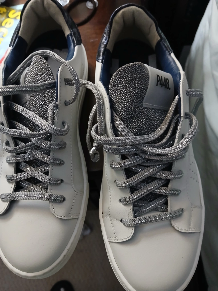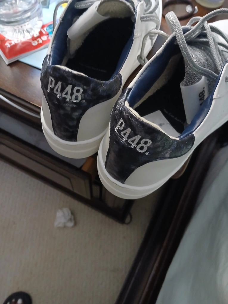 Selling a pair of P448 sneakers in white leather. These are in great condition and ready for a new home. They feature a stylish design with grey laces and a unique textured accent. Perfect for adding a touch of Italian flair to your wardrobe