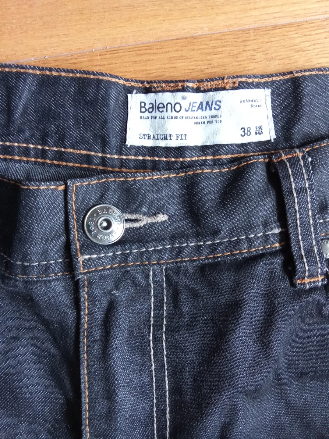 Baleno Jeans in a straight fit style. Dark wash denim fabric. These jeans are a size 38 waist. They feature a classic five-pocket design.