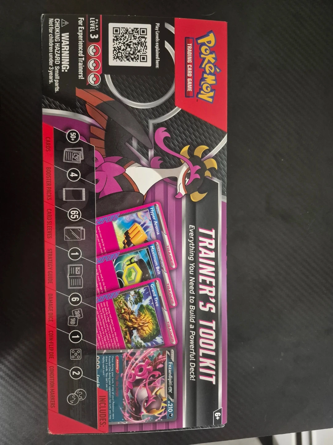 This opened Pokémon Trainer's Toolkit is everything you need to build a powerful deck. It includes 50+ cards, card sleeves, and a strategy guide. Also included are damage dice, a coin-flip die, and condition markers. Extra cards added