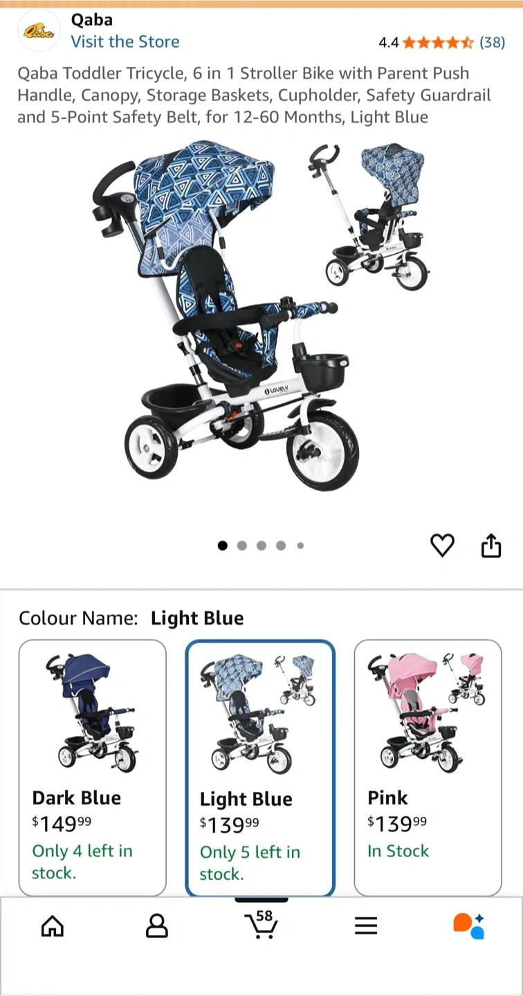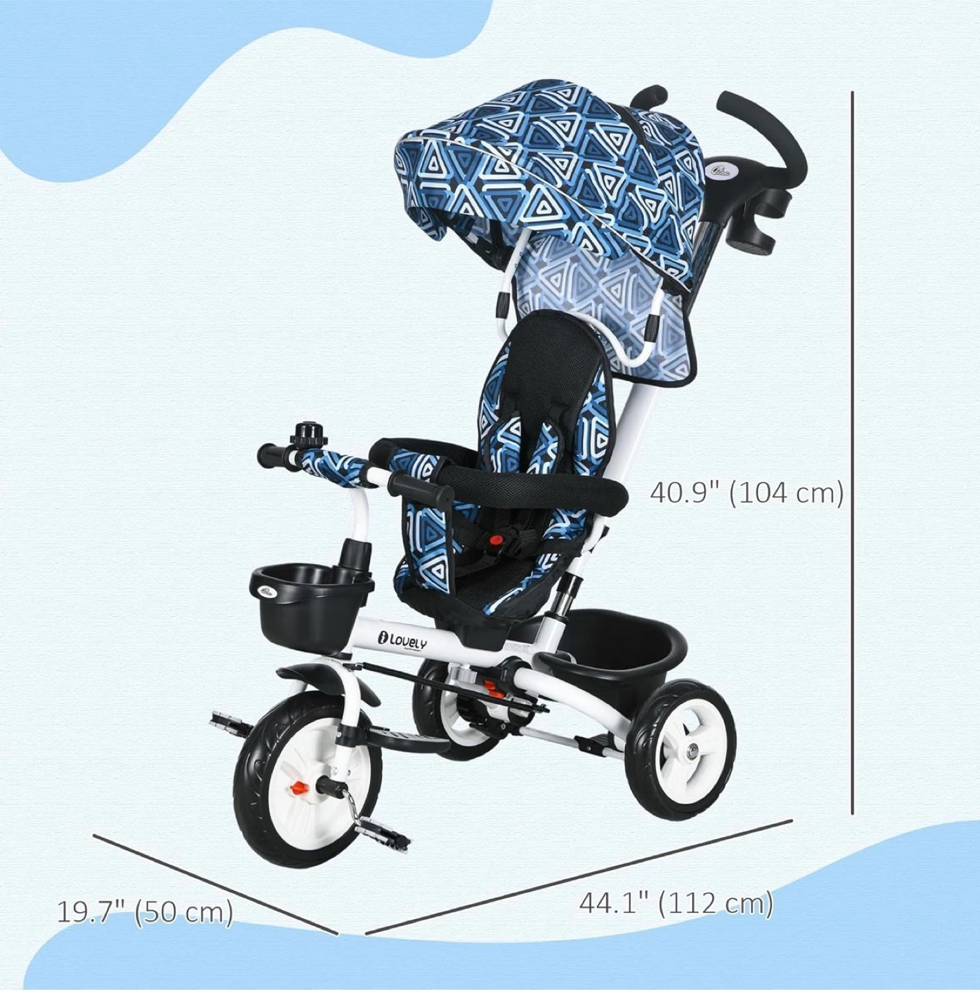 Brand new in box Qaba 6-in-1 toddler tricycle offers versatile configurations to grow with your child. It features a parent push handle, canopy, safety guardrail, and a 5-point safety belt. Dimensions are 44.1" (112 cm) long, 19.7" (50 cm) wide, and 40.9" (104 cm) high. Recommended for ages 12-60 months.