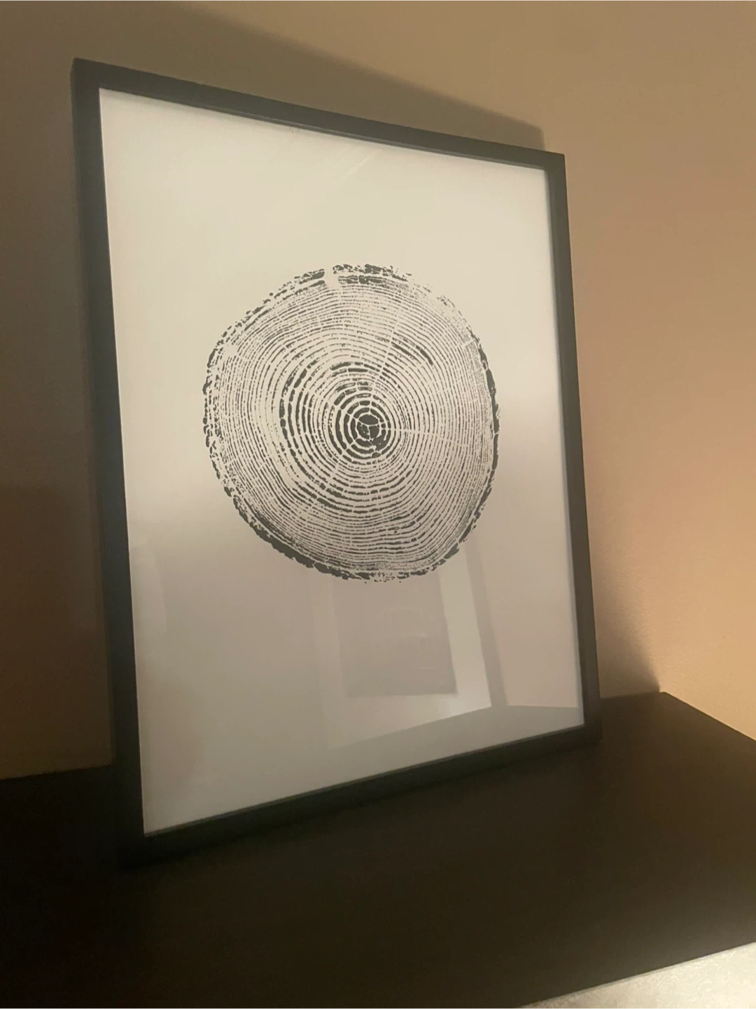 Black framed art print featuring a monochrome tree ring design. The print has a white matting and a black frame. It's a stylish piece for any room!