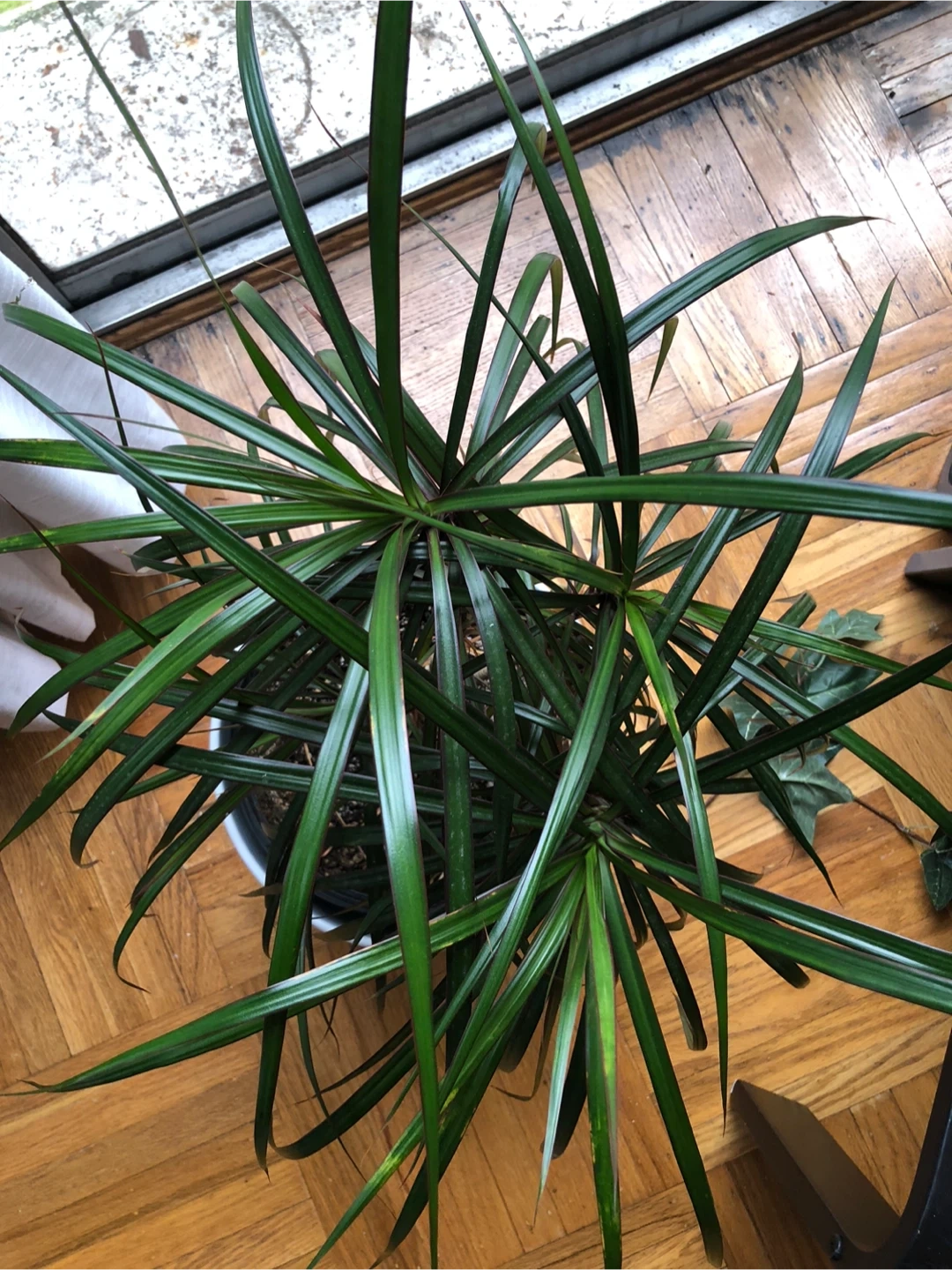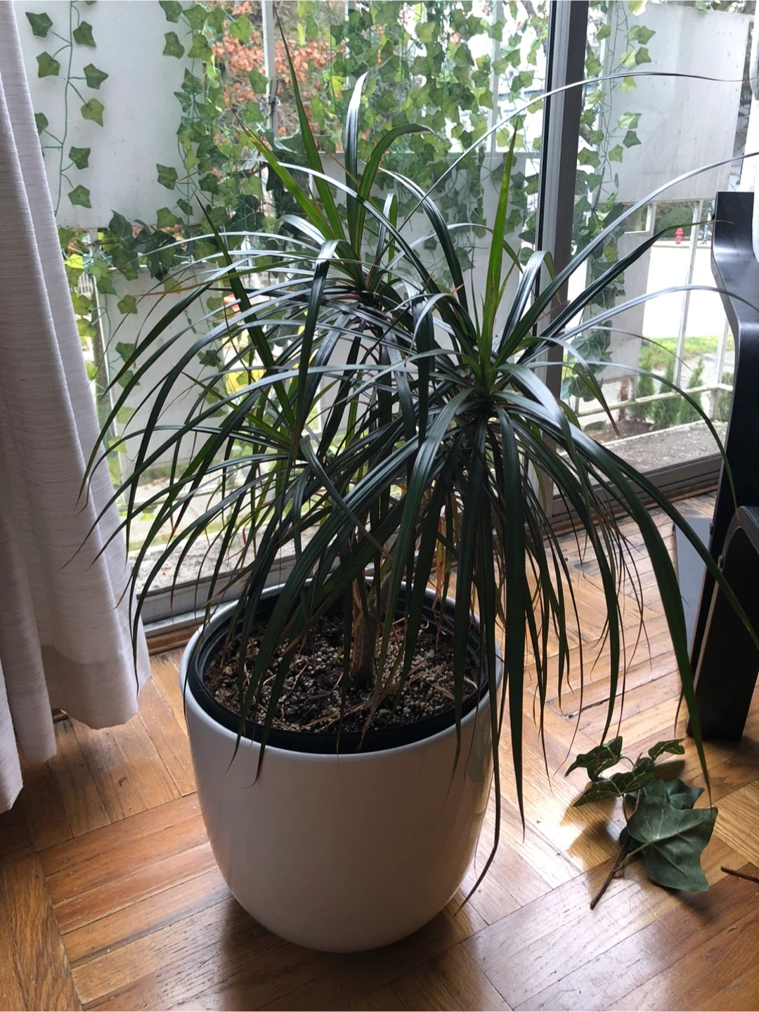 Healthy Dracaena plant in a large white ceramic pot. This plant features long, slender green leaves. It's a great addition to any indoor space for a touch of greenery. The pot has a smooth, modern design.