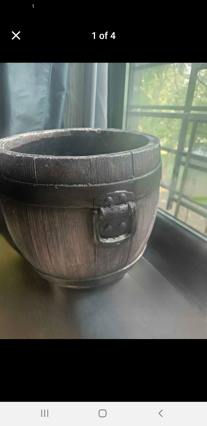 This barrel-shaped planter pot has a rustic design. It's made from a durable material with a textured finish. It's great for housing small plants indoors or outdoors!