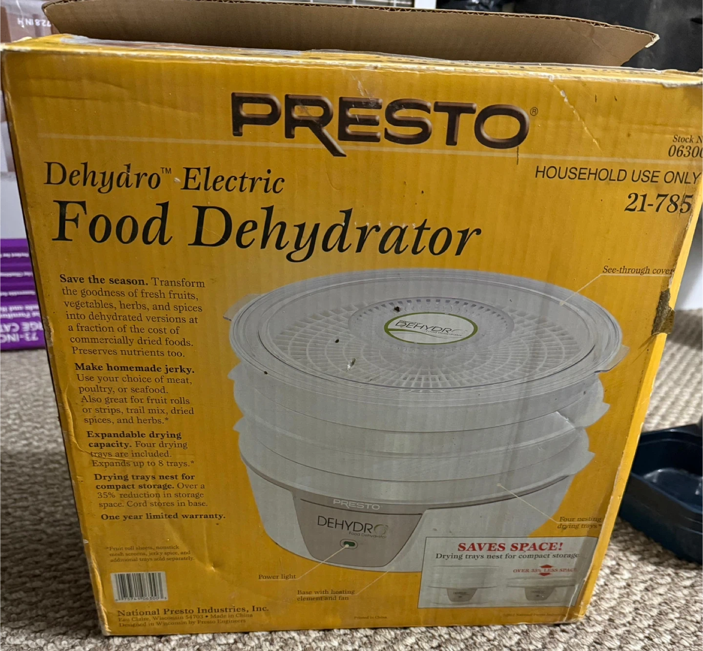 This Presto Dehydro Electric Food Dehydrator comes with four drying trays, expandable up to eight. Its drying trays nest for compact storage. Features a base with a heating element and fan.