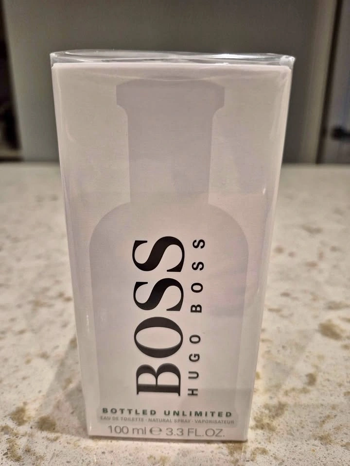 New Hugo Boss Bottled Unlimited Eau de Toilette. It is 100ml size. Has cool notes of iced violet leaves, pineapple, sandalwood, and musk. Great scent!