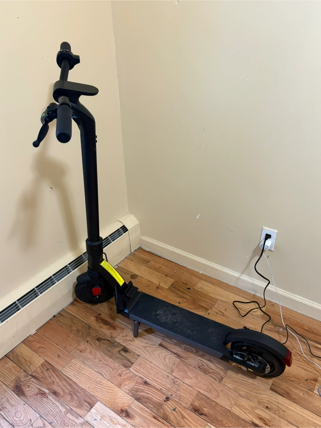 This is a black electric scooter. It's designed for personal transportation. The scooter includes a charging cable but needs a new battery.