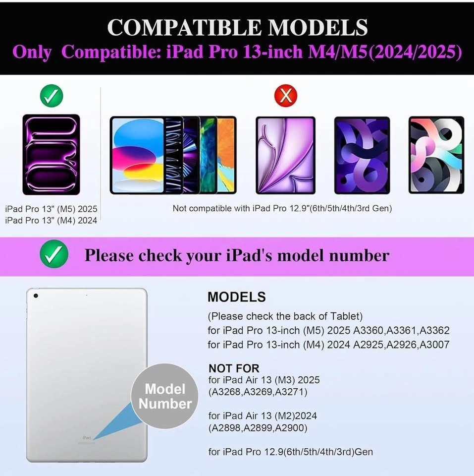 iPad Pro 13 inch Keyboard Case: Tailor-made only for iPad Pro 13 inch M5/M4 2025/2024. Important:Please check iPad model before purchase! Models include: A2925, A3007, A3360, A3361, A3362, A3363